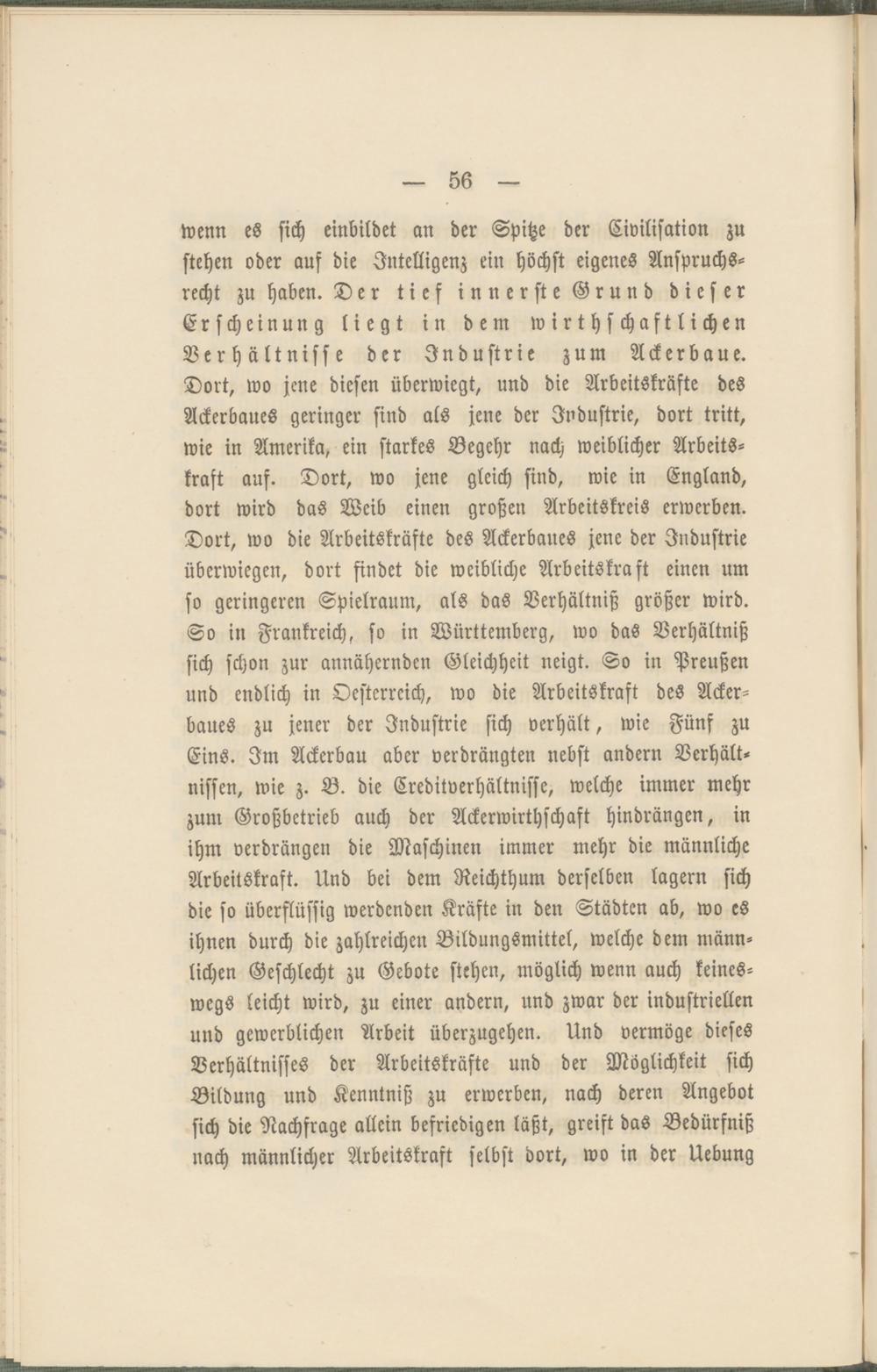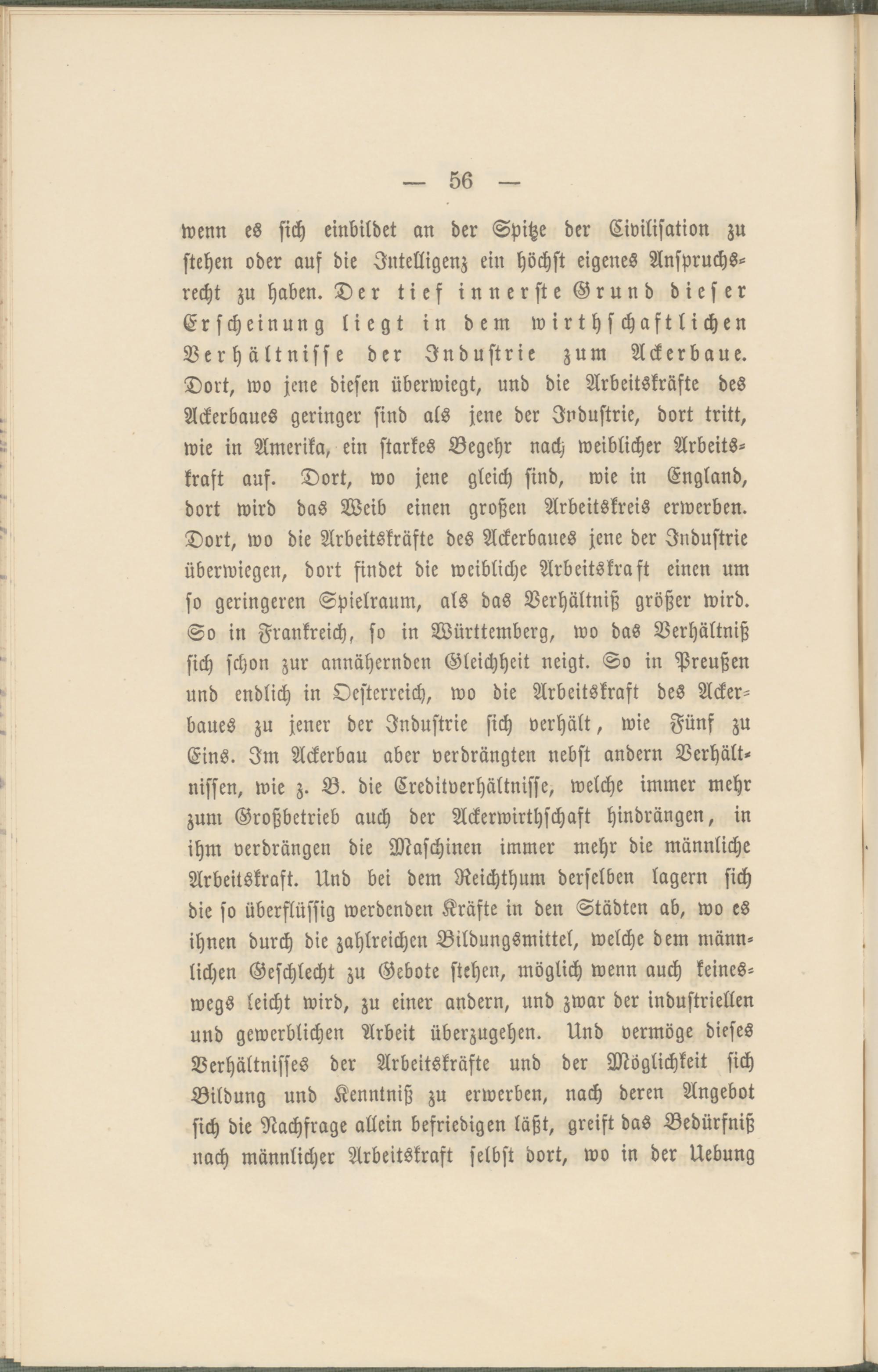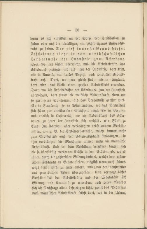 wenn es sich einbildet an der Spitze der Civilisation zu stehen oder aus die Intelligenz ein höchst eigenes Anspruchsrecht zu haben. Der tief inner sie Grund dieser Erscheinung liegt in dem wirtschaftlichen Verhältnisse der Industrie zum Ackerbaue. Dort, wo jene diesen überwiegt, und die Arbeitskräfte des Ackerbaues geringer sind als jene der Industrie, dort tritt, wie in Amerika, ein starkes Begehr nach weiblicher Arbeitskraft auf. Dort, wo jene gleich sind, wie in England, dort wird das Weib einen großen Arbeitskreis erwerben. Dort, wo die Arbeitskräfte des Ackerbaues jene der Industrie überwiegen, dort findet die weibliche Arbeitskraft einen um so geringeren Spielraum, als das Verhältniß größer wird. So in Frankreich, so in Württemberg, wo das Verhältniß sich schon zur annähernden Gleichheit neigt. So in Preußen und endlich in Oesterreich, wo die Arbeitskraft des Ackerbaues zu jener der Industrie sich verhält, wie Fünf zu Eins. Im Ackerbau aber verdrängten nebst andern Verhältnissen, wie z. B. die Creditverhältnisse, welche immer mehr zum Großbetrieb auch der Ackerwirthschaft hindrängen, in ihm verdrängen die Maschinen immer mehr die männliche Arbeitskraft. Und bei dem Reichthum derselben lagern sich die so überflüssig werdenden Kräfte in den Städten ab, wo es ihnen durch die zahlreichen Bildungsmittel, welche dem männlichen Geschlecht zu Gebote stehen, möglich wenn auch keineswegs leicht wird, zu einer andern, und zwar der industriellen und gewerblichen Arbeit überzugehen. Und vermöge dieses Verhältnisses der Arbeitskräfte und der Möglichkeit sich Bildung und Kenntniß zu erwerben, nach deren Angebot sich die Nachfrage allein befriedigen läßt, greift das Bedürfniß nach männlicher Arbeitskraft selbst dort, wo in der Uebung
