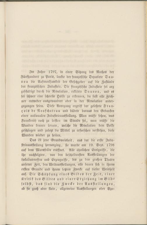 Das ist jene Grundweisheit, aus der die erste Industrieausstellung hervorging, sie wurde am 19. Sept. 1798 auf dem Marsfelde eröffnet. Alle ähnlichen Ereignisse, die ihr nachfolgten, von den bescheidensten Ausstellungen der Lokalinteressen und Erzeugnisse, bis zu den großen Thaten unserer Zeit, den Weltausstellungen, alle bauen sich in ihrem ersten Grunde und ihrem letzten Zwecke auf dieser Weisheit auf. Die Schöpfung eines Bildes der Zeit, einer Kritik desBildes und einerErziehung imBilde selbst, das sind die Zwecke der Ausstellungen, ob sie groß oder klein, allgemeine Ausstellungen oder Spe-