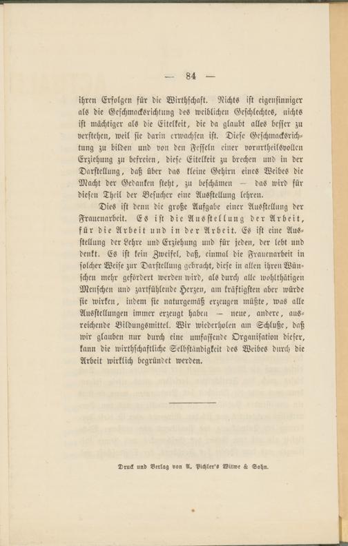 Dies ist denn die große Aufgabe einer Ausstellung der Frauenarbeit. Es ist die Ausstellung der Arbeit, für die Arbeit und in der Arbeit. Es ist eine Ausstellung der Lehre und Erziehung und für jeden, der lebt und denkt. Es ist kein Zweifel, daß, einmal die Frauenarbeit in solcher Weise zur Darstellung gebracht, diese in allen ihren Wünschen mehr gefördert werden wird, als durch alle wohlthätigen Menschen und zartfühlende Herzen, ain kräftigsten aber würde sie wirken, indem sie naturgemäß erzeugen müßte, was alle Ausstellungen immer erzeugt habeu — neue, andere, ausreichende Bildungsmittel. Wir wiederholen am Schluße, daß wir glauben nur durch eine umfassende Organisation dieser, kann die wirthschaftliche Selbständigkeit des Weibes durch die Arbeit wirklich begründet werden.