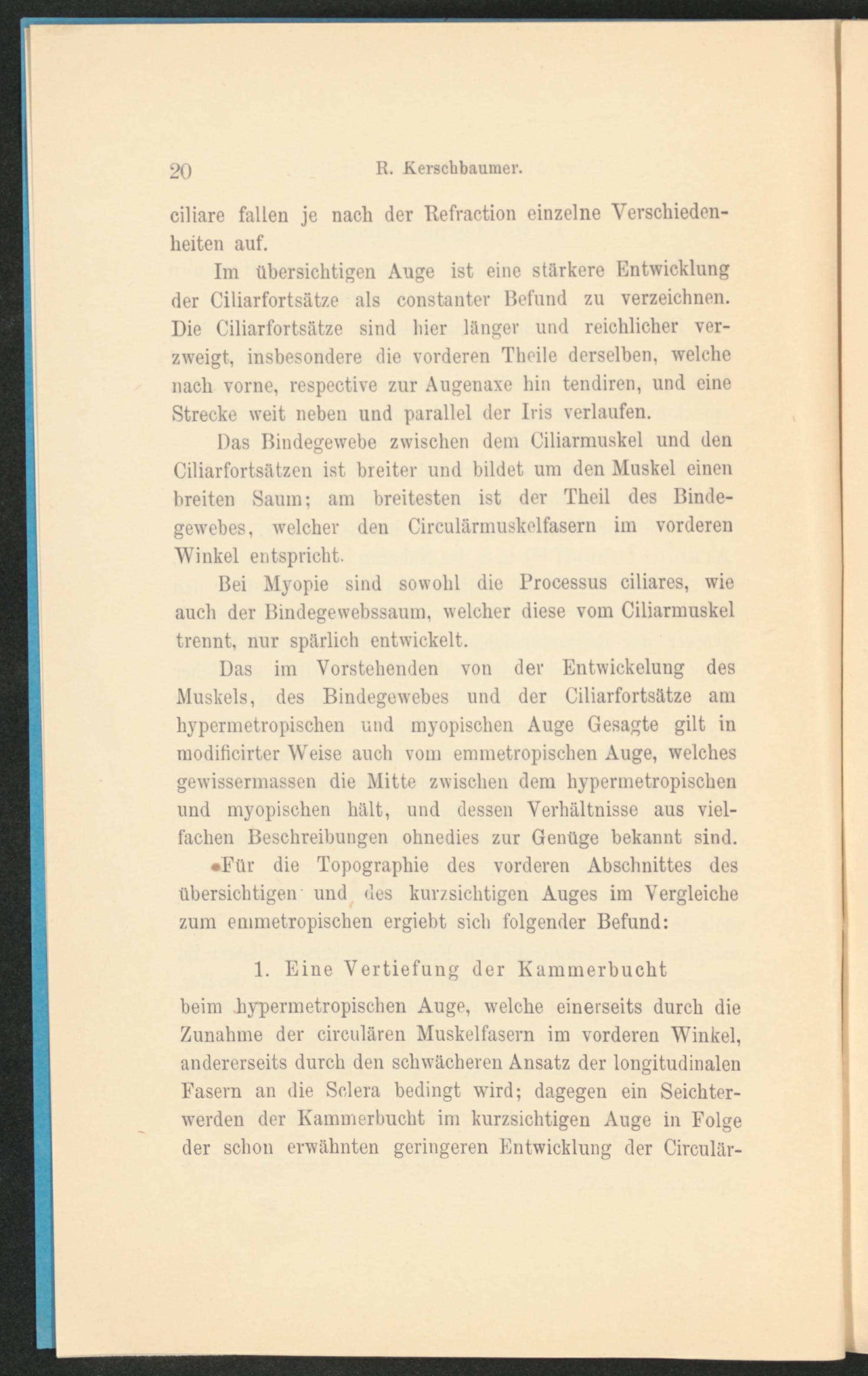 beim hypermetropischen Auge, welche einerseits durch die Zunahme der circulären Muskelfasern im vorderen Winkel, andererseits durch den schwächeren Ansatz der longitudinalen Fasern an die Sclera bedingt wird; dagegen ein Seichterwerden der Kammerbucht im kurzsichtigen Auge in Folge der schon erwähnten geringeren Entwicklung der Circular-