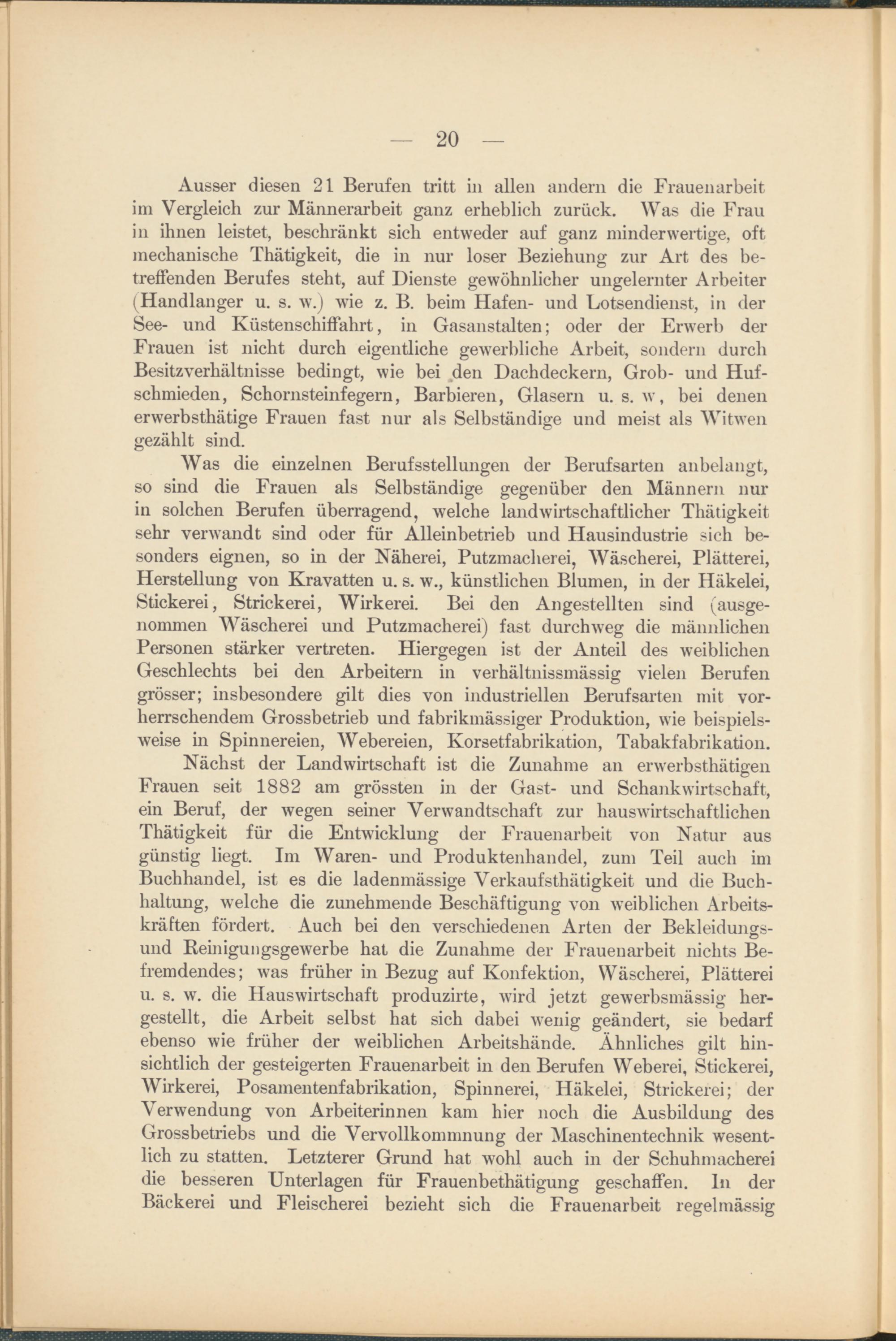 Nächst der Landwirtschaft ist die Zunahme an erwerbsthätigen Frauen seit 1882 am grössten in der Gast- und Schankwirtschaft, ein Beruf, der wegen seiner Verwandtschaft zur hauswirtschaftlichen Thätigkeit für die Entwicklung der Frauenarbeit von Natur aus günstig liegt. Im Waren- und Produktenhandel, zum Teil auch im Buchhandel, ist es die ladenmässige Verkaufsthätigkeit und die Buchhaltung, welche die zunehmende Beschäftigung von weiblichen Arbeitskräften fördert. Auch bei den verschiedenen Arten der Bekleidungsund Keinigungsgewerbe hat die Zunahme der Frauenarbeit nichts Befremdendes; was früher in Bezug auf Konfektion, Wäscherei, Plätterei u. s. w. die Hauswirtschaft produzirte, wird jetzt gewerbsmässig hergestellt, die Arbeit selbst hat sich dabei v 7 enig geändert, sie bedarf ebenso wie früher der weiblichen Arbeitshände. Ähnliches gilt hinsichtlich der gesteigerten Frauenarbeit in den Berufen Weberei, Stickerei, Wirkerei, Posamentenfabrikation, Spinnerei, Häkelei, Strickerei; der Verwendung von Arbeiterinnen kam hier noch die Ausbildung des Grossbetriebs und die Vervollkommnung der Maschinentechnik wesentlich zu statten. Letzterer Grund hat w 7 ohl auch in der Schuhmacherei die besseren Unterlagen für Frauenbethätigung geschaffen, ln der Bäckerei und Fleischerei bezieht sich die Frauenarbeit regelmässig