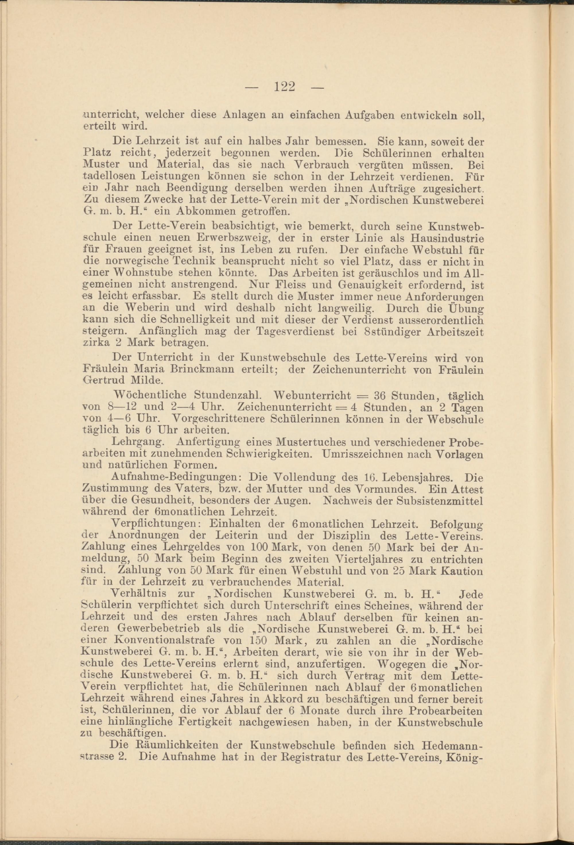 Die Lehrzeit ist auf ein halbes Jahr bemessen. Sie kann, soweit der Platz reicht, jederzeit begonnen werden. Die Schülerinnen erhalten Muster und Material, das sie nach Verbrauch vergüten müssen. Bei tadellosen Leistungen können sie schon in der Lehrzeit verdienen. Für eiD Jahr nach Beendigung derselben werden ihnen Aufträge zugesichert. Zu diesem Zwecke hat der Lette-Verein mit der „Nordischen Kunstweberei G. m. b. H.“ ein Abkommen getroffen.