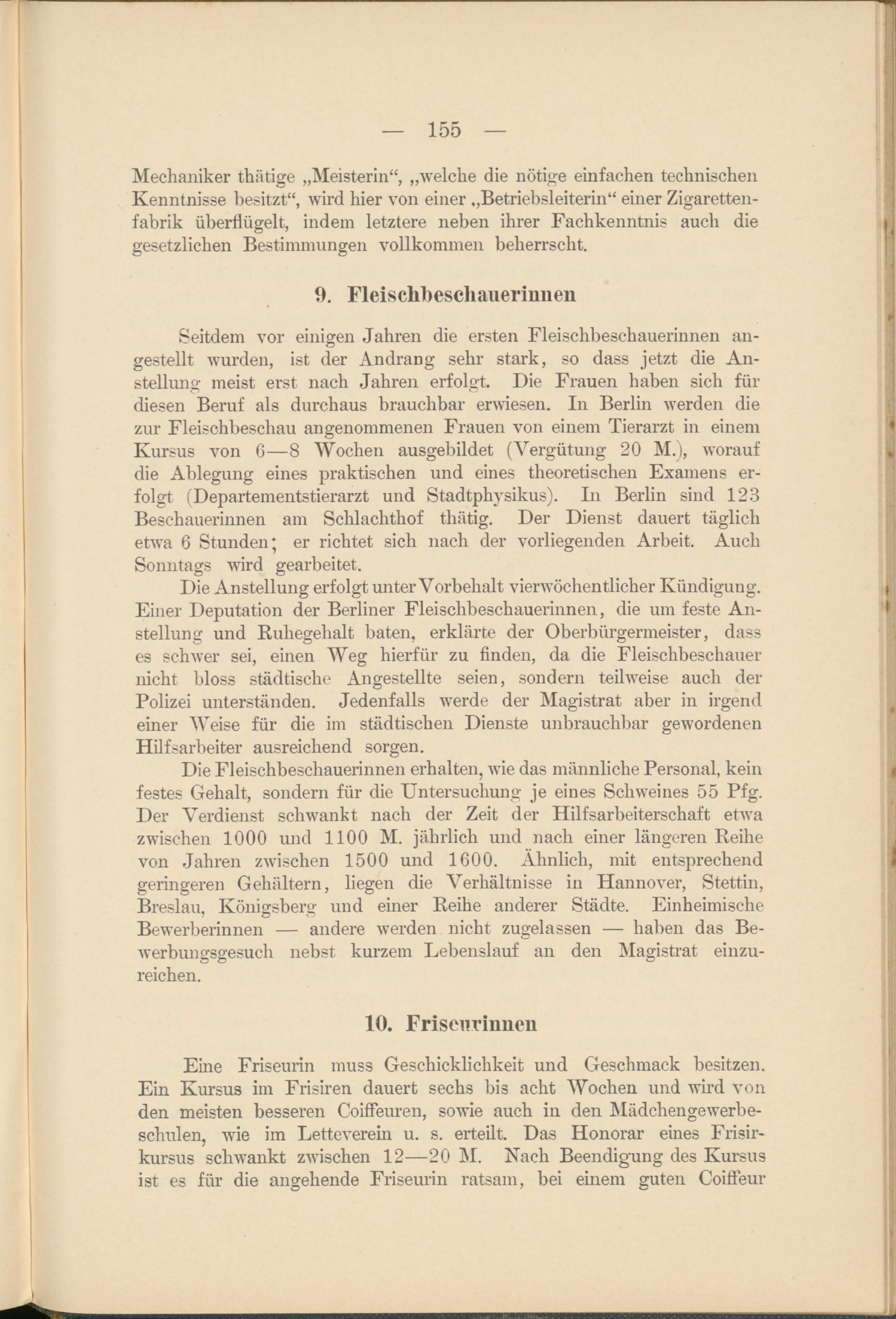 Die Fleischbeschauerinnen erhalten, wie das männliche Personal, kein festes Gehalt, sondern für die Untersuchung je eines Schweines 55 Pfg. Der Verdienst schwankt nach der Zeit der Hilfsarbeiterschaft etwa zwischen 1000 und 1100 M. jährlich und nach einer längeren Reihe von Jahren zwischen 1500 und 1600. Ähnlich, mit entsprechend geringeren Gehältern, liegen die Verhältnisse in Hannover, Stettin, Breslau, Königsberg und einer Reihe anderer Städte. Einheimische Bewerberinnen — andere werden nicht zugelassen — haben das Bewerbungsgesuch nebst kurzem Lebenslauf an den Magistrat einzureichen.