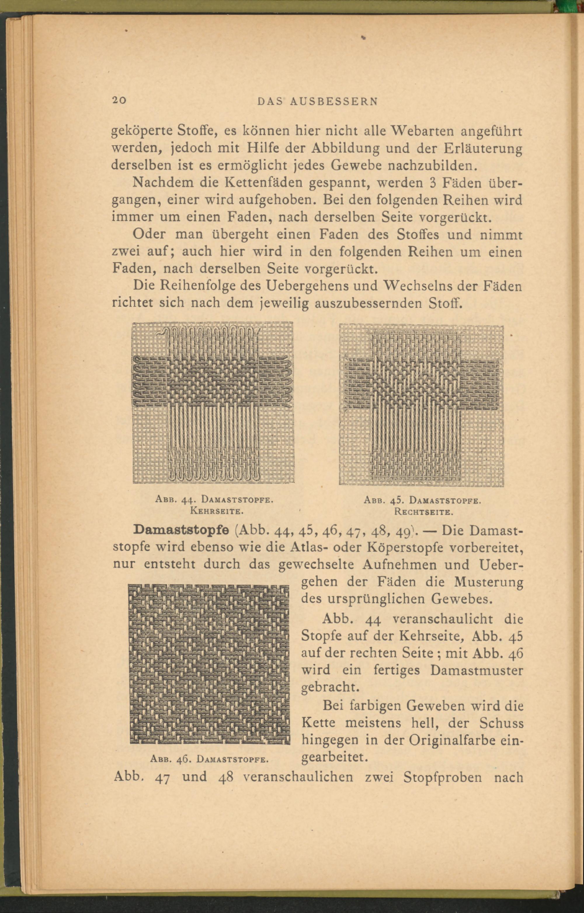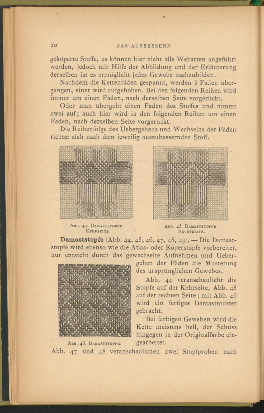 Abb. 44 veranschaulicht die Stopfe auf der Kehrseite, Abb. 45 auf der rechten Seite ; mit Abb. 46 wird ein fertiges Damastmuster gebracht.