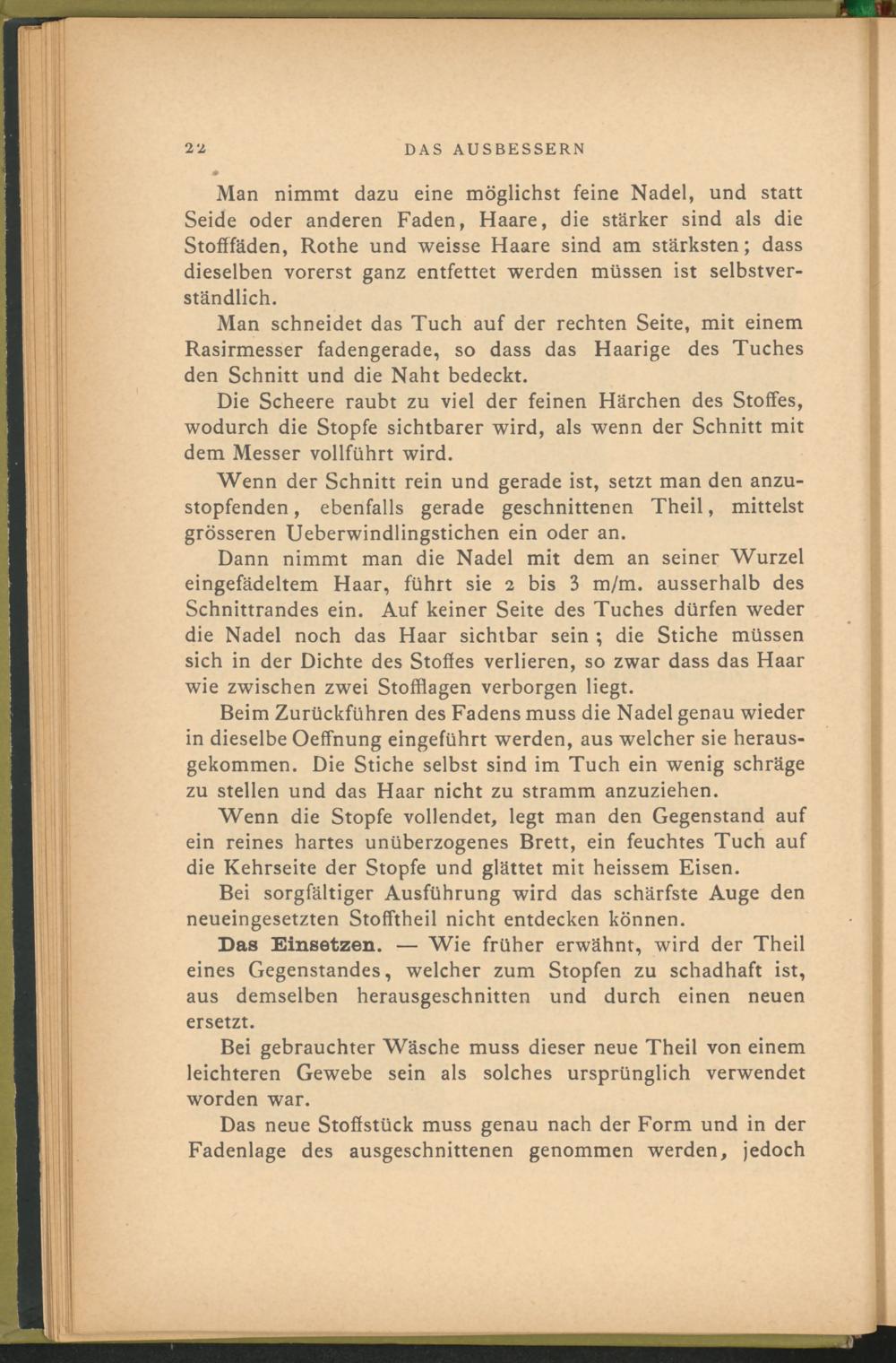 Dann nimmt man die Nadel mit dem an seiner Wurzel eingefädeltem Haar, führt sie 2 bis 3 m/m. ausserhalb des Schnittrandes ein. Auf keiner Seite des Tuches dürfen weder die Nadel noch das Haar sichtbar sein ; die Stiche müssen sich in der Dichte des Stoffes verlieren, so zwar dass das Haar wie zwischen zwei Stofflagen verborgen liegt.