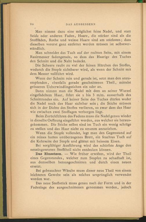Man nimmt dazu eine möglichst feine Nadel, und statt Seide oder anderen Faden, Haare, die stärker sind als die Stofffäden, Rothe und weisse Haare sind am stärksten; dass dieselben vorerst ganz entfettet werden müssen ist selbstverständlich.
