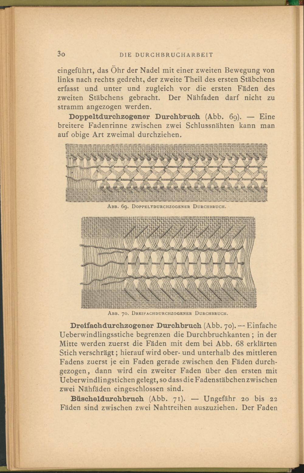Doppeltdurehzogener Durchbruch (Abb. 69). — Eine breitere Fadenrinne zwischen zwei Schlussnähten kann man auf obige Art zweimal durchziehen.