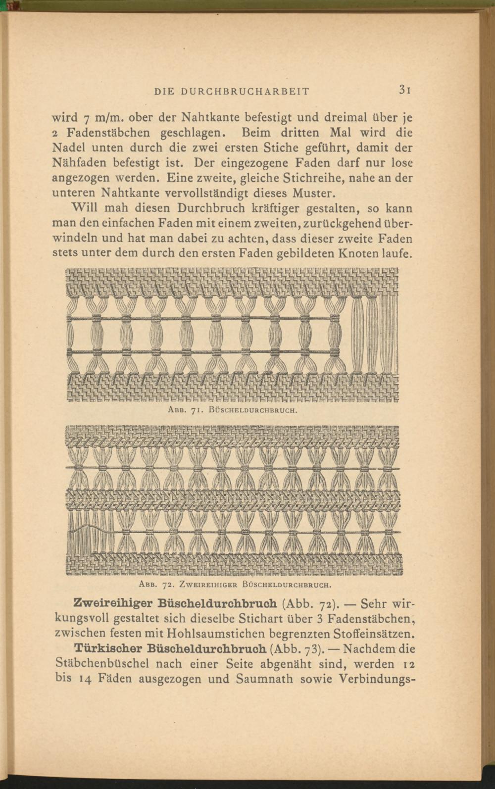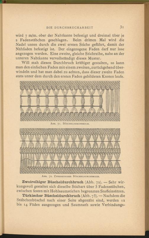 Türkischer Büscheldurchbruch (Abb. 73). — Nachdem die Stäbchenbüschel nach einer Seite abgenäht sind, werden 12 bis 14 Fäden ausgezogen und Saumnath sowie Verbindungs-