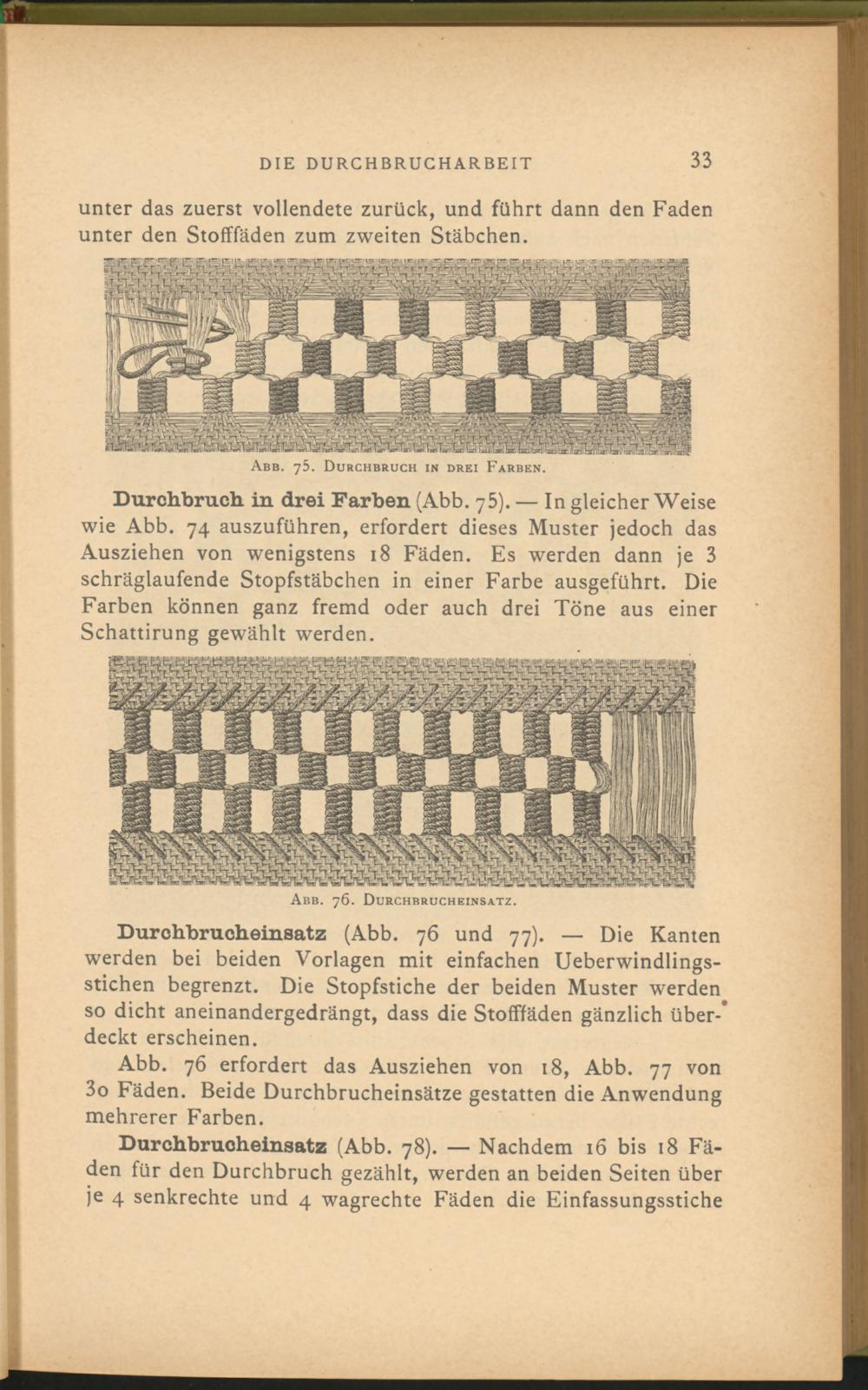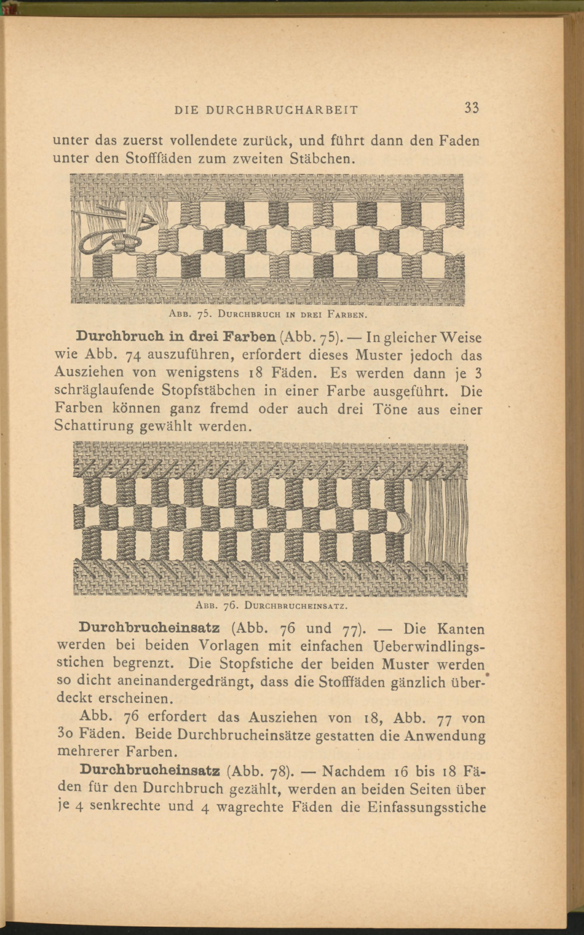 Abb. 76 erfordert das Ausziehen von 18, Abb. 77 von 3 o Fäden. Beide Durchbrucheinsätze gestatten die Anwendung mehrerer Farben.