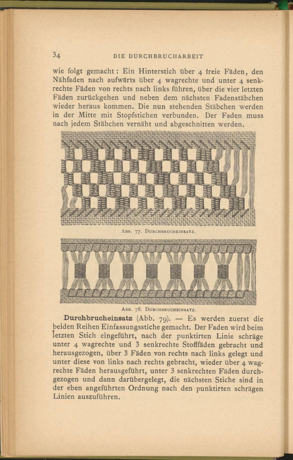 Durchbrucheinsatz (Abb. 79). — Es werden zuerst die beiden Reihen Einfassungsstiche gemacht. Der Faden wird beim letzten Stich eingeführt, nach der punktirten Linie schräge unter 4 wagrechte und 3 senkrechte Stofffäden gebracht und herausgezogen, über 3 Fäden von rechts nach links gelegt und unter diese von links nach rechts gebracht, wieder über 4 wagrechte Fäden herausgeführt, unter 3 senkrechten Fäden durchgezogen und dann darübergelegt, die nächsten Stiche sind in der eben angeführten Ordnung nach den punktirten schrägen Linien auszuführen.