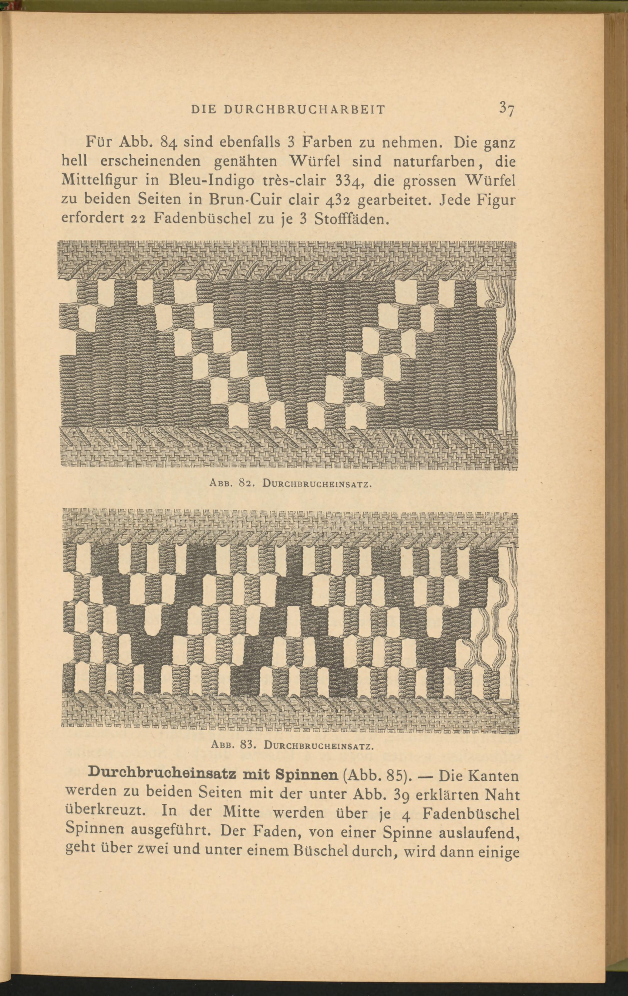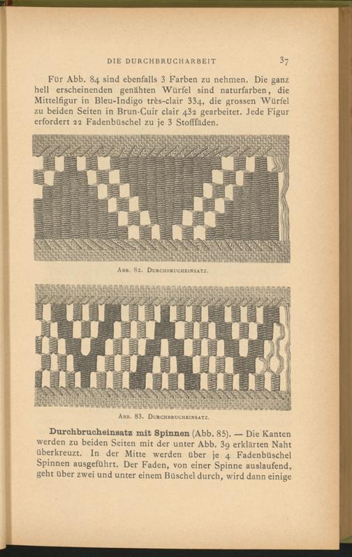 Für Abb. 84 sind ebenfalls 3 Farben zu nehmen. Die ganz hell erscheinenden genähten Würfel sind naturfarben, die Mittelfigur in Bleu-Indigo très-clair 334, die grossen Würfel zu beiden Seiten in Brun-Cuir clair 432 gearbeitet. Jede Figur erfordert 22 Fadenbüschel zu je 3 Stofffäden.