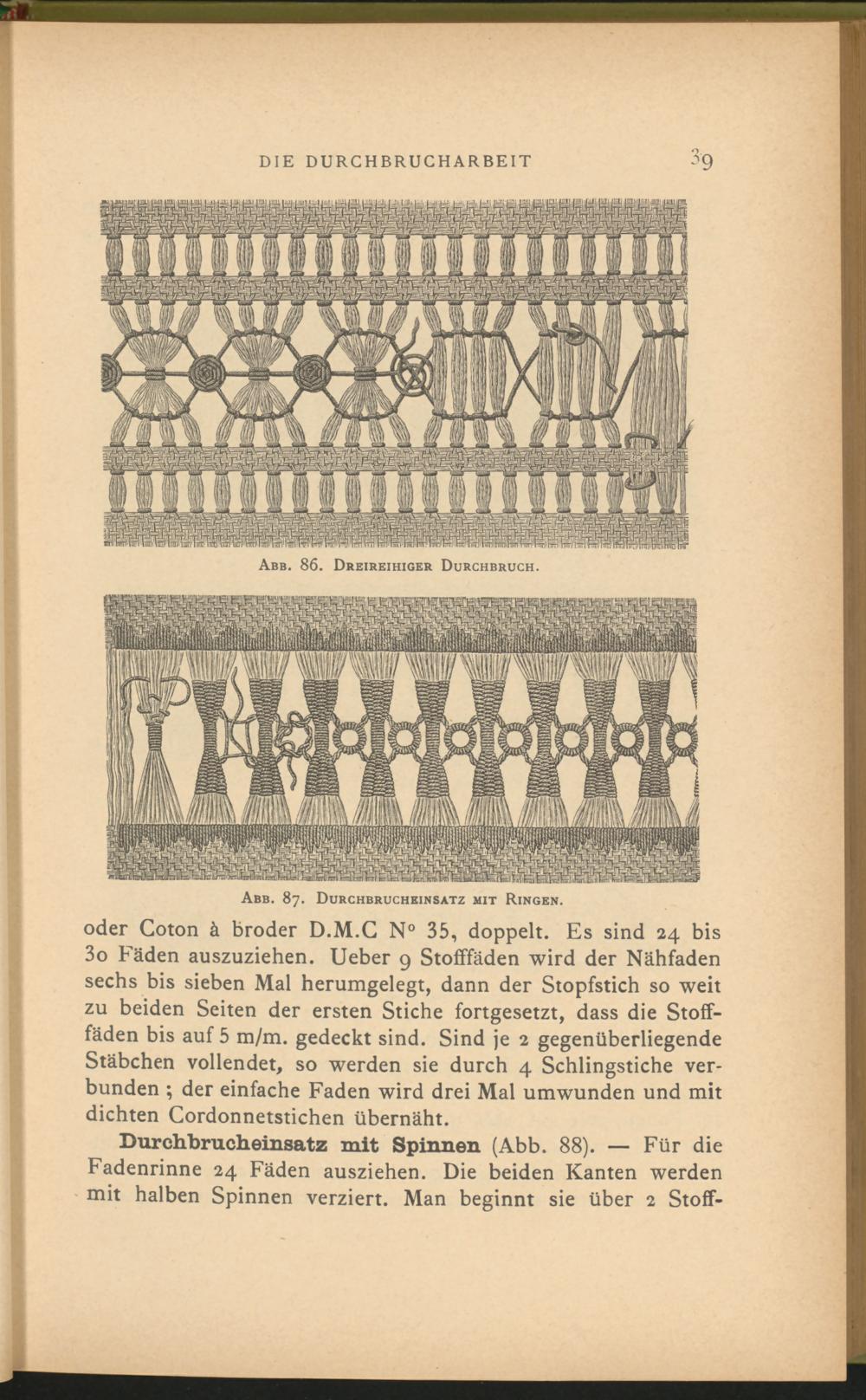 Durehbrucheinsatz mit Spinnen (Abb. 88). — Für die Fadenrinne 24 Fäden ausziehen. Die beiden Kanten werden mit halben Spinnen verziert. Man beginnt sie über 2 Stoff-