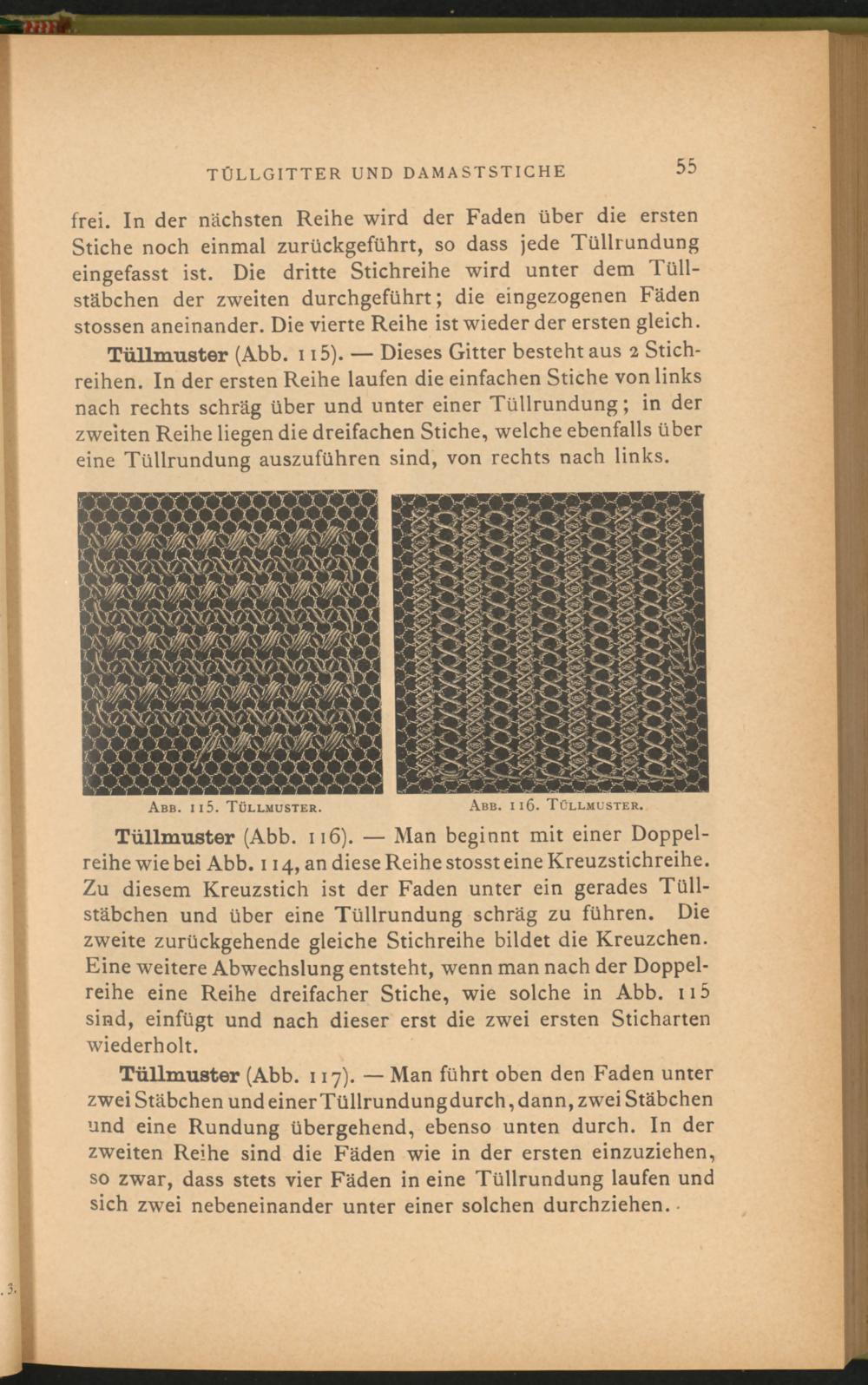 TüUmuster (Abb. 11 5 ). — Dieses Gitter besteht aus 2 Stichreihen. In der ersten Reihe laufen die einfachen Stiche von links nach rechts schräg über und unter einer Tüllrundung; in der zweiten Reihe liegen die dreifachen Stiche, welche ebenfalls über eine Tüllrundung auszuführen sind, von rechts nach links.
