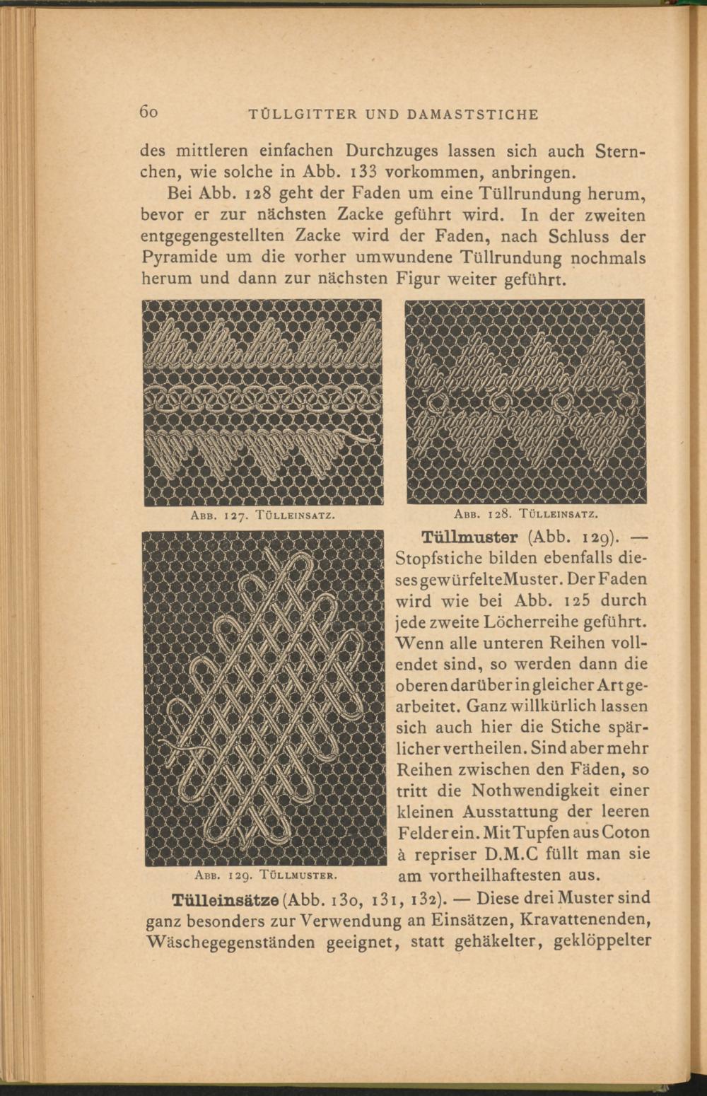 Tülleinsätze (Abb. i3o, 13 1, i 32). — Diese drei Muster sind ganz besonders zur Verwendung an Einsätzen, Kravattenenden, Wäschegegenständen geeignet, statt gehäkelter, geklöppelter