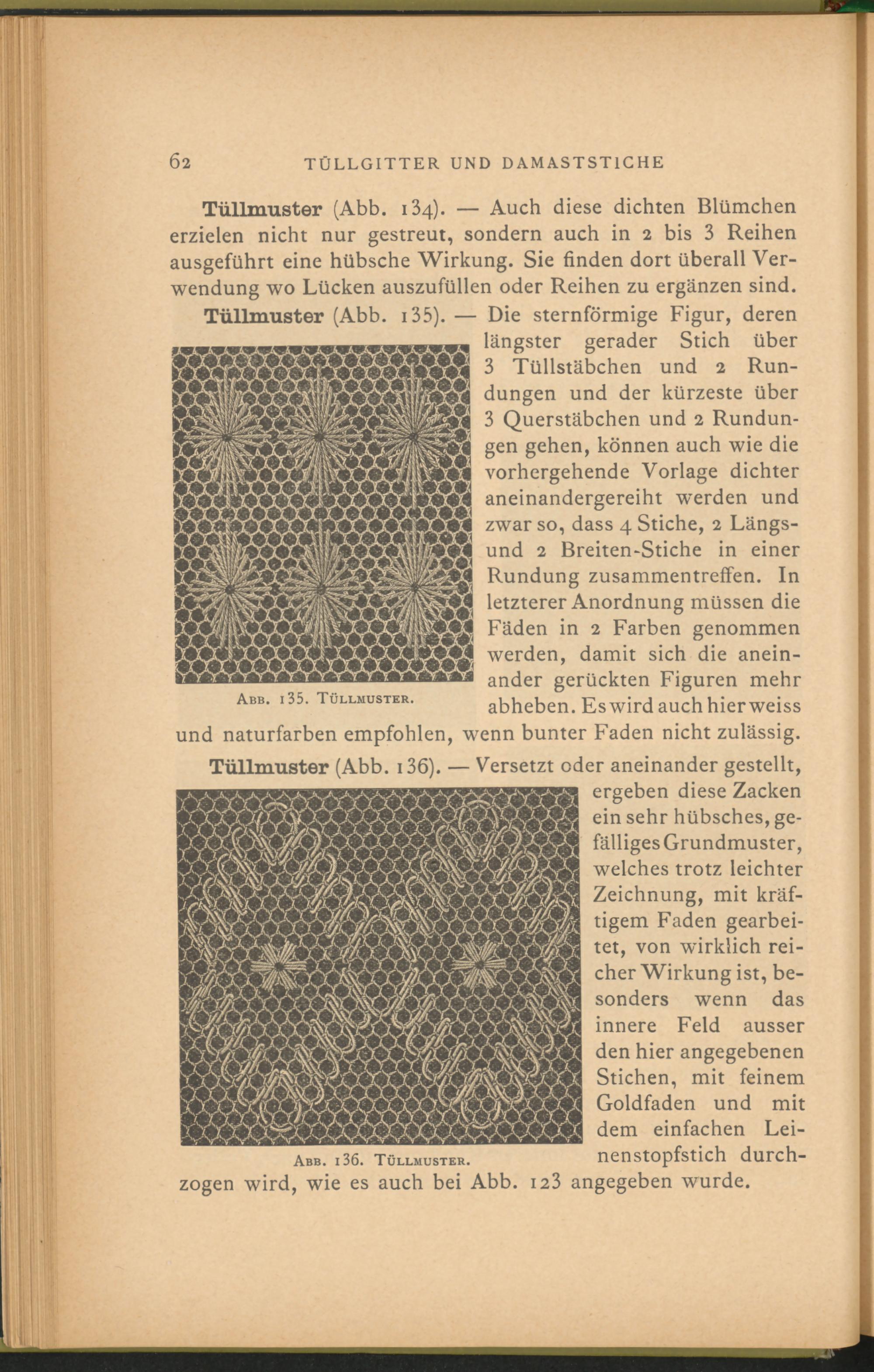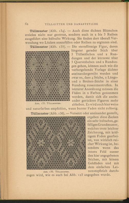 Tüllmuster (Abb. 134). — Auch diese dichten Blümchen erzielen nicht nur gestreut, sondern auch in 2 bis 3 Reihen ausgeführt eine hübsche Wirkung. Sie finden dort überall Verwendung wo Lücken auszufüllen oder Reihen zu ergänzen sind. Tüllmuster (Abb. 1 35 ). — Die sternförmige Figur, deren