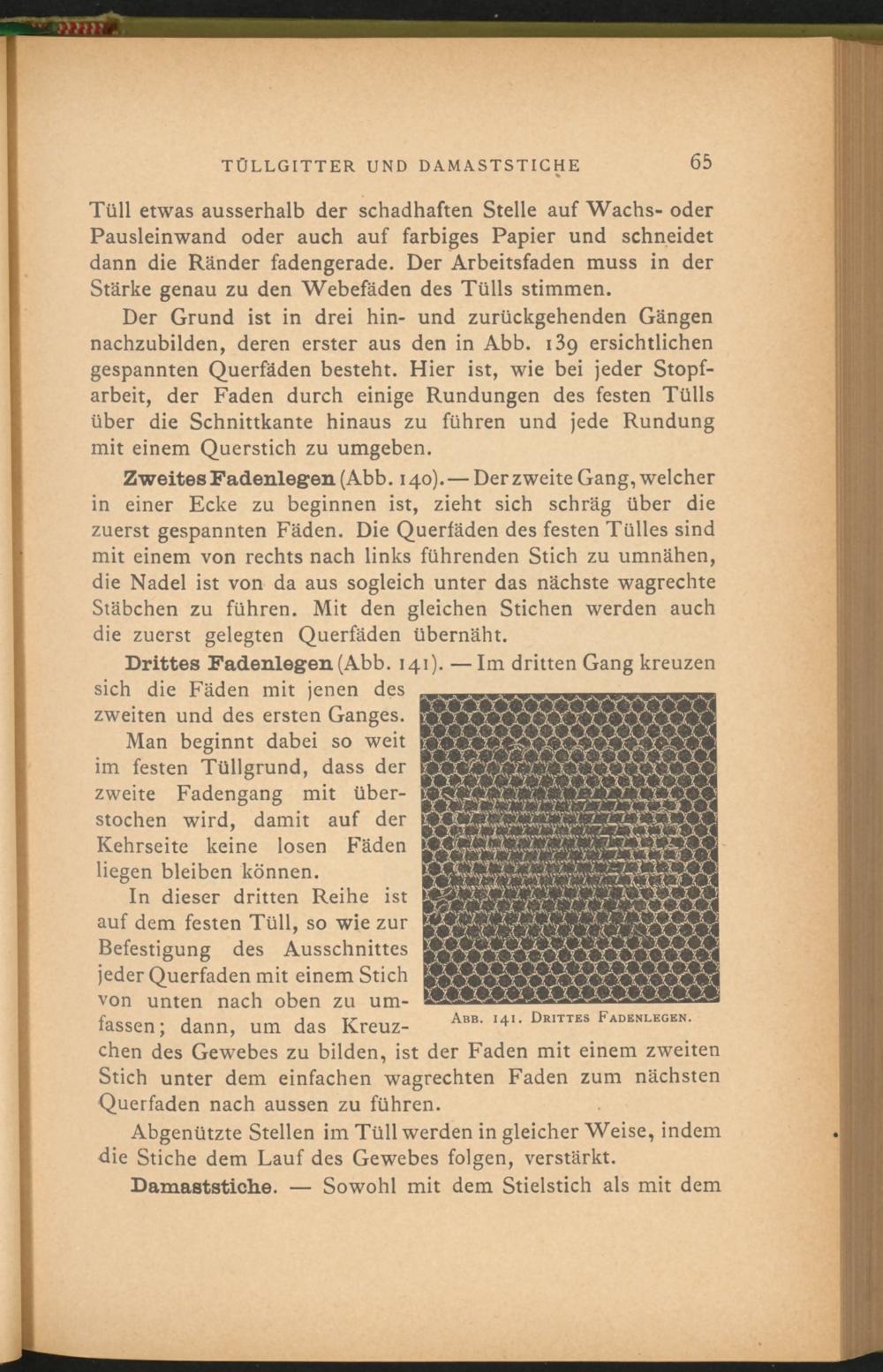 Zweites Fadenlegen (Abb. 140). — Der zweite Gang, welcher in einer Ecke zu beginnen ist, zieht sich schräg über die zuerst gespannten Fäden. Die Querfäden des festen Tülles sind mit einem von rechts nach links führenden Stich zu umnähen, die Nadel ist von da aus sogleich unter das nächste wagrechte Stäbchen zu führen. Mit den gleichen Stichen werden auch die zuerst gelegten Querfäden übernäht.