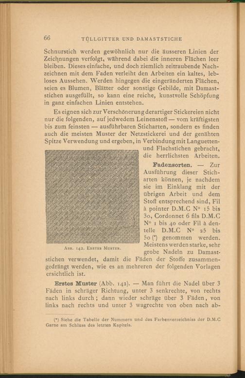 Erstes Muster (Abb. 142 ). — Man führt die Nadel über 3 Fäden in schräger Richtung, unter 3 senkrechte, von rechts nach links durch ; dann wieder schräge über 3 Fäden, von links nach rechts und unter 3 wagrechte von oben nach ab-