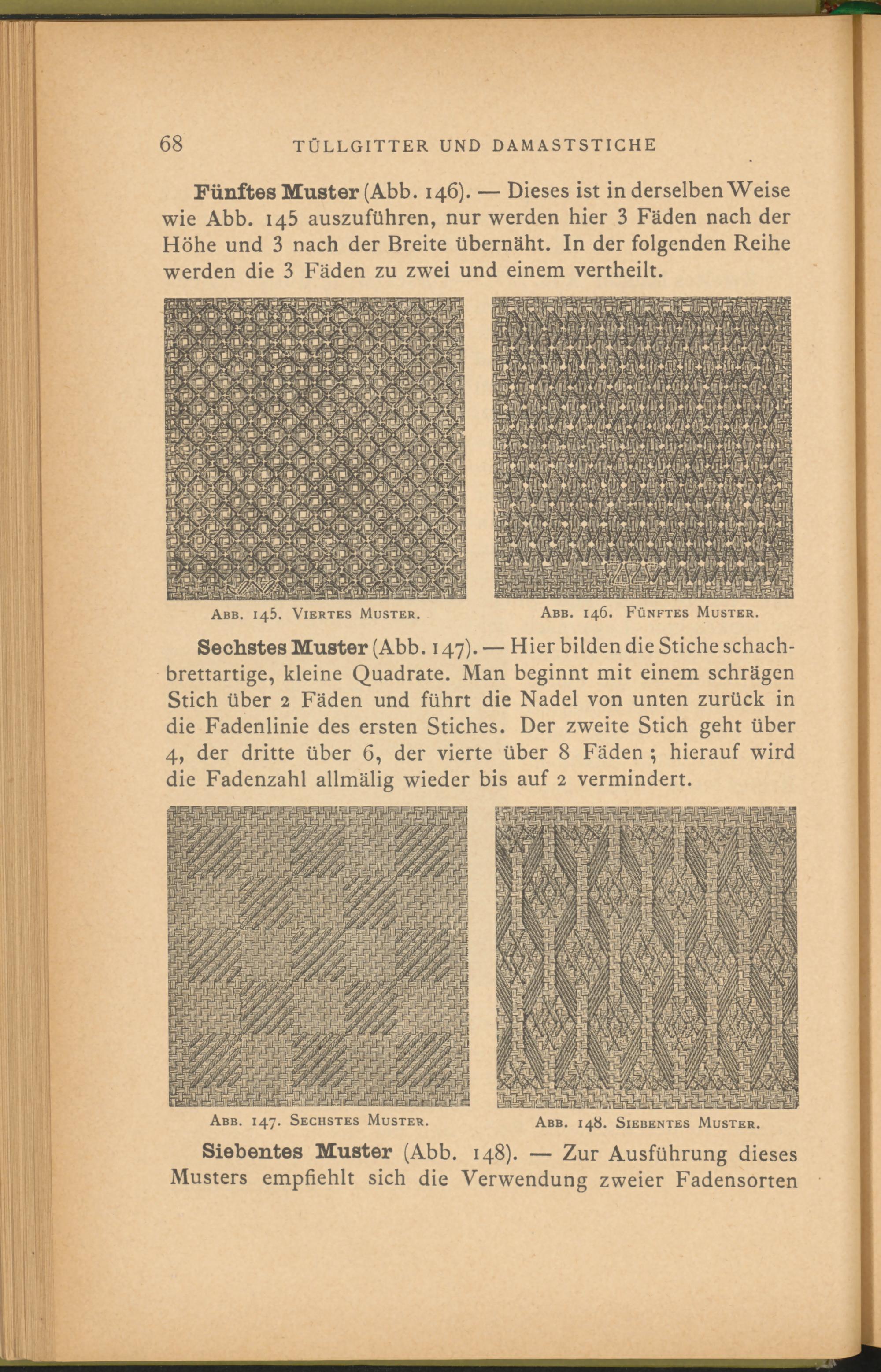 Fünftes Muster (Abb. 146). — Dieses ist in derselben Weise wie Abb. 145 auszuführen, nur werden hier 3 Fäden nach der Höhe und 3 nach der Breite übernäht. In der folgenden Reihe werden die 3 Fäden zu zwei und einem vertheilt.