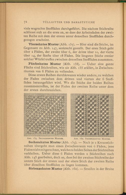 Fünfzehntes Muster (Abb. 158). — Ueber eine ganze Fläche sind Stichreihen, wie sie Abb. 155 erklärt, in Zwischenräumen von 6 Fäden zu vollenden.