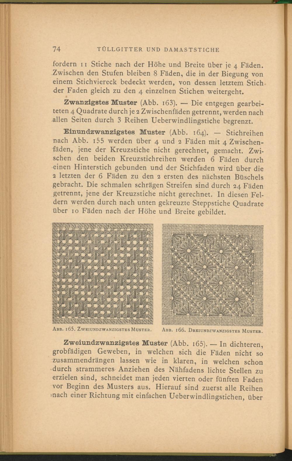 Zweiundzwanzigstes Muster (Abb. 165). — In dichteren, grobfädigen Geweben, in welchen sich die Fäden nicht so zusammendrängen lassen wie in klaren, in welchen schon durch strammeres Anziehen des Nähfadens lichte Stellen zu erzielen sind, schneidet man jeden vierten oder fünften Faden vor Beginn des Musters aus. Hierauf sind zuerst alle Reihen mach einer Richtung mit einfachen Ueberwindlingstichen, über