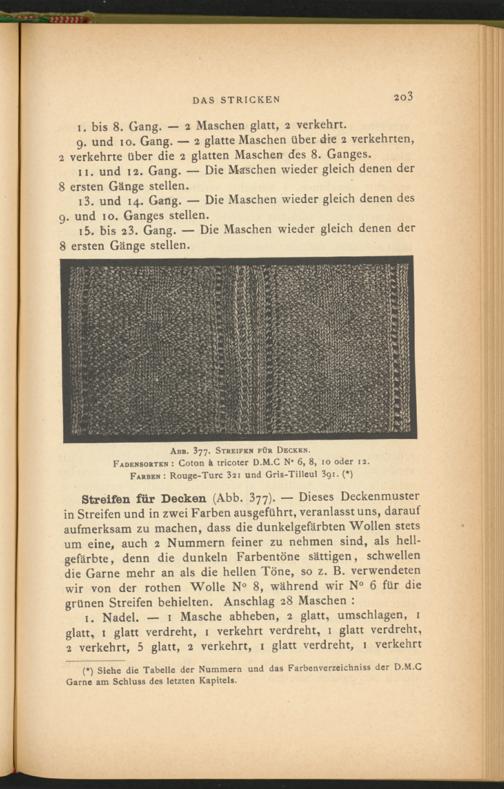 Streifen für Decken (Abb. 377). — Dieses Deckenmuster in Streifen und in zwei Farben ausgeführt, veranlasst uns, darauf aufmerksam zu machen, dass die dunkelgefärbten Wollen stets um eine, auch 2 Nummern feiner zu nehmen sind, als hellgefärbte, denn die dunkeln Farbentöne sättigen, schwellen die Garne mehr an als die hellen Töne, so z. B. verwendeten wir von der rothen Wolle N° 8, während wir N° 6 für die grünen Streifen behielten. Anschlag 28 Maschen :