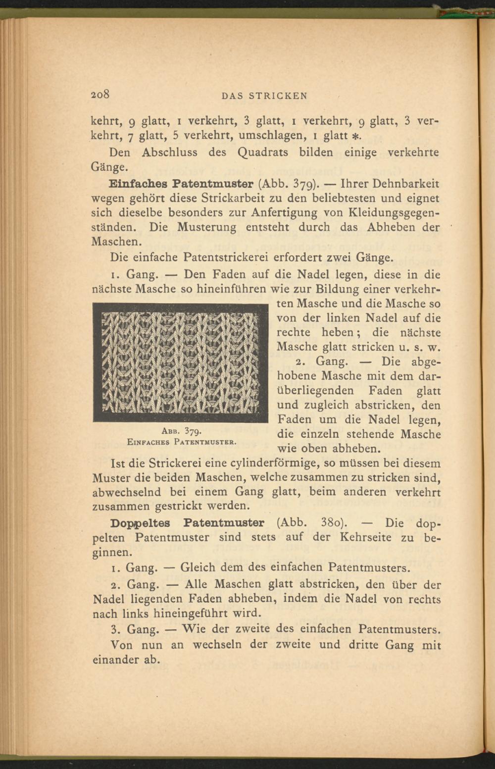 Einfaches Patentmuster (Abb. 379). — Ihrer Dehnbarkeit wegen gehört diese Strickarbeit zu den beliebtesten und eignet sich dieselbe besonders zur Anfertigung von Kleidungsgegenständen. Die Musterung entsteht durch das Abheben der Maschen.