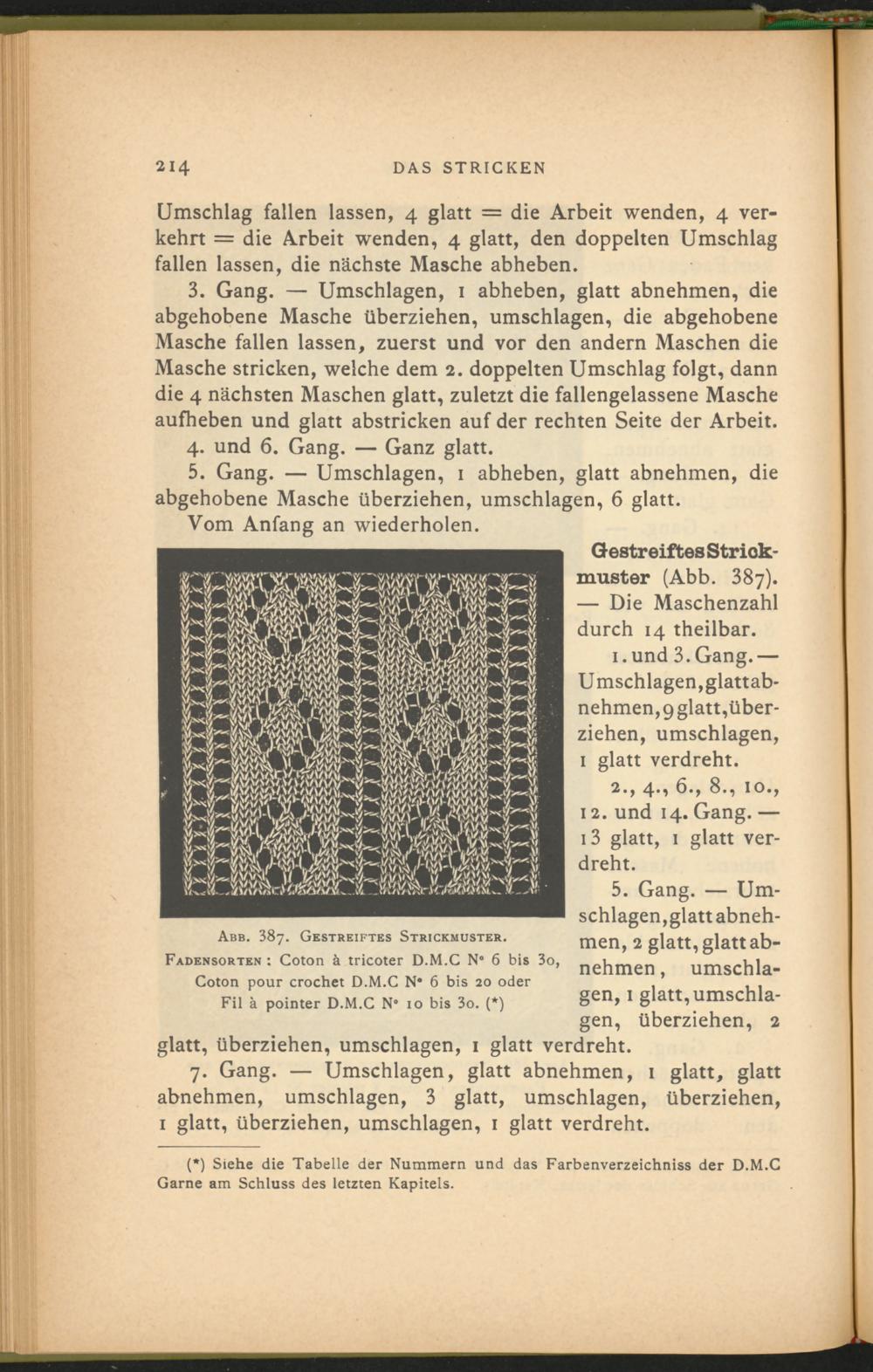 Abb. 387. Gestreiftes Strickmuster. Fadensorten : Coton à tricoter D.M.C N” 6 bis 3o, Coton pour crochet D.M.C N* 6 bis 20 oder Fil à pointer D.M.C N* 10 bis 3o. (*)