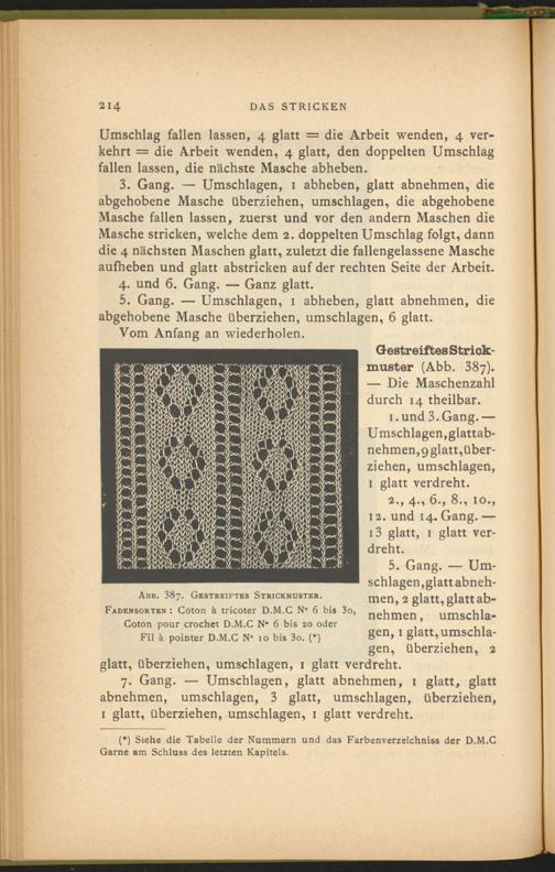 Gestreiftes Striok- muster (Abb. 387). — Die Maschenzahl durch 14 theilbar.