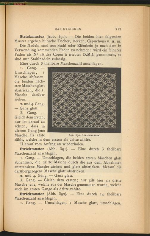 Strickmuster (Abb. 391). — Eine durch 3 theilbare Maschenzahl anschlagen.