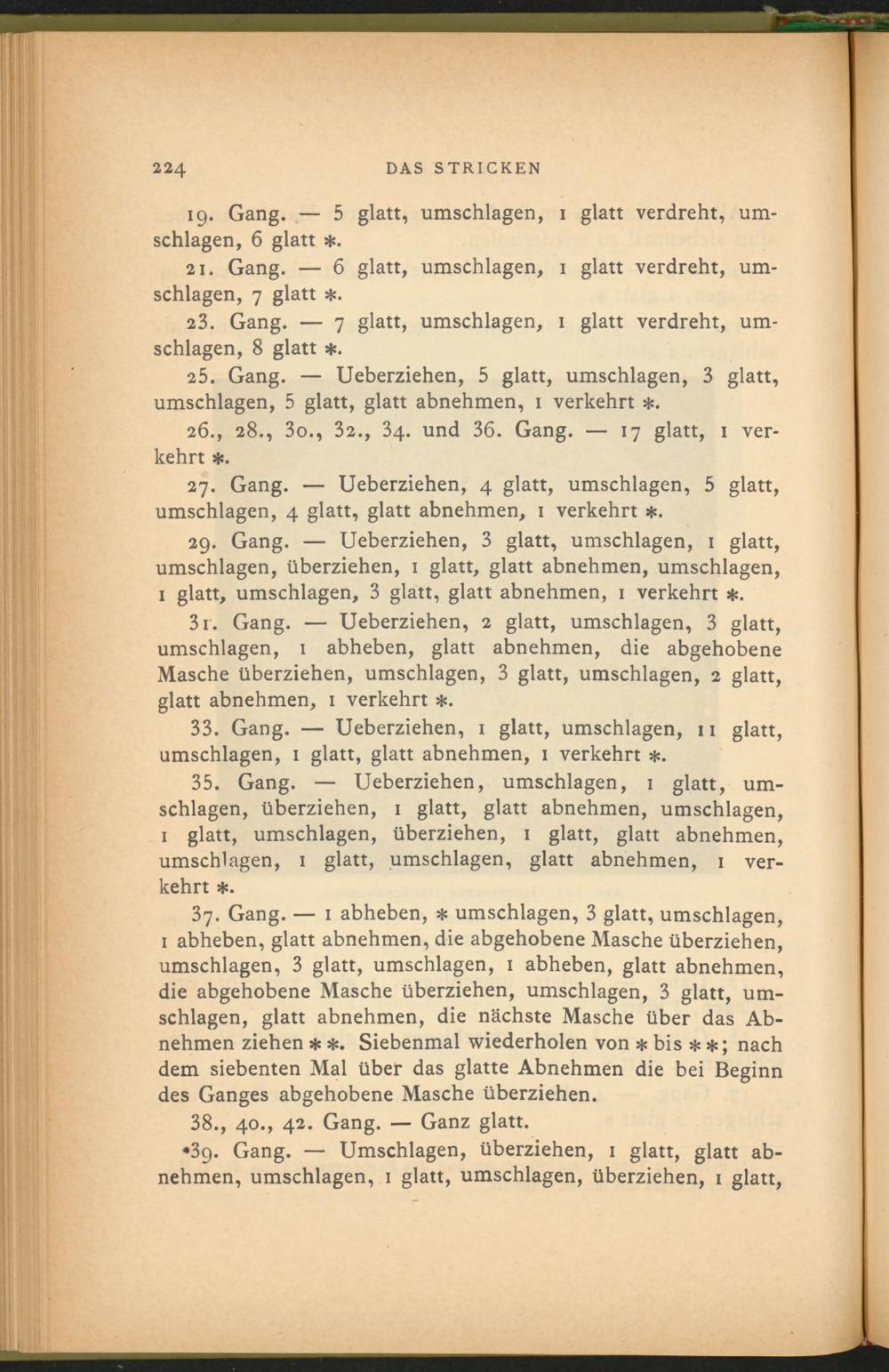 •39. Gang. — Umschlagen, überziehen, 1 glatt, glatt abnehmen, umschlagen, 1 glatt, umschlagen, überziehen, 1 glatt,