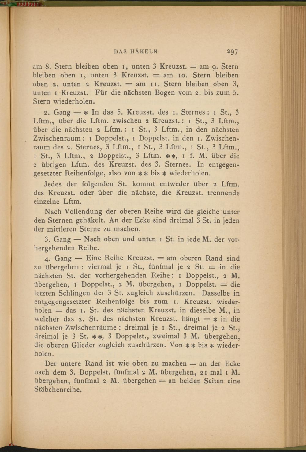 am 8. Stern bleiben oben i, unten 3 Kreuzst. = am 9. Stern bleiben oben 1, unten 3 Kreuzst. = am 10. Stern bleiben oben 2, unten 2 Kreuzst. = am 11. Stern bleiben oben 3, unten 1 Kreuzst. Für die nächsten Bogen vom 2. bis zum 5. Stern wiederholen.