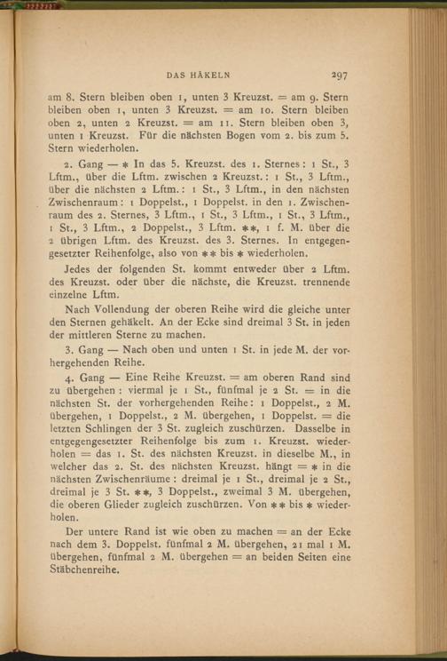 2. Gang — * In das 5. Kreuzst. des 1. Sternes: 1 St., 3 Lftm., über die Lftm. zwischen 2 Kreuzst.: 1 St., 3 Lftm., über die nächsten 2 Lftm.: 1 St., 3 Lftm., in den nächsten Zwischenraum: 1 Doppelst., 1 Doppelst, in den 1. Zwischenraum des 2. Sternes, 3 Lftm., 1 St., 3 Lftm., 1 St., 3 Lftm.,