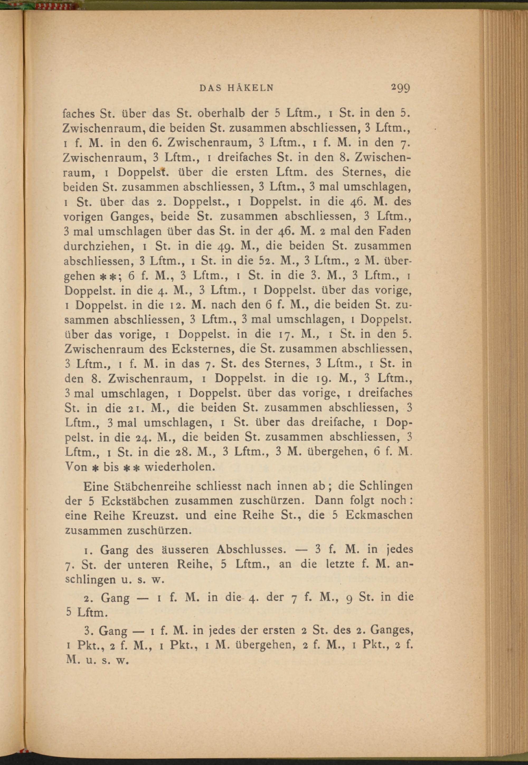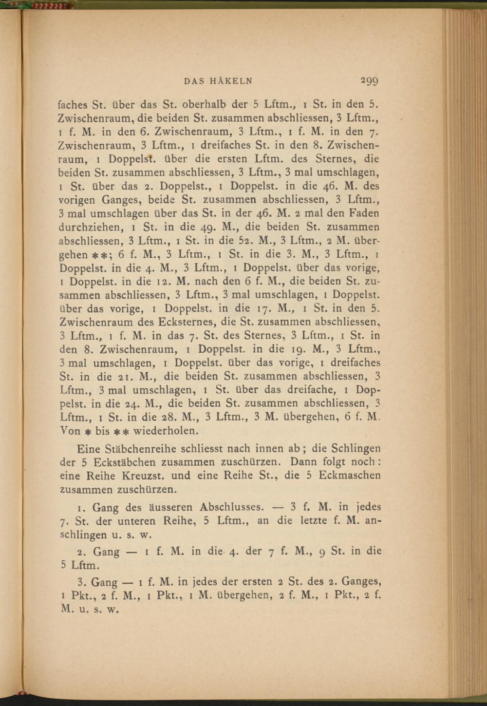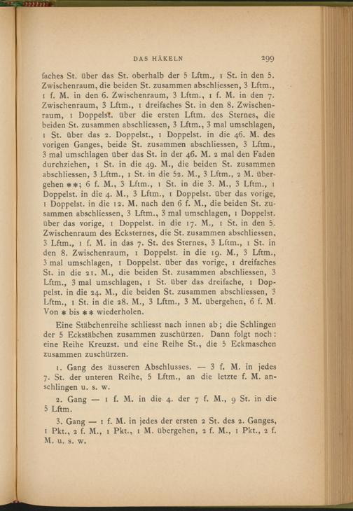 1 St. über das 2. Doppelst., 1 Doppelst, in die 46. M. des vorigen Ganges, beide St. zusammen abschliessen, 3 Lftm., 3 mal Umschlägen über das St. in der 46. M. 2 mal den Faden durchziehen, 1 St. in die 49. M., die beiden St. zusammen abschliessen, 3 Lftm., 1 St. in die 52. M., 3 Lftm., 2 M. übergehen 6 f. M., 3 Lftm., 1 St. in die 3. M., 3 Lftm., 1 Doppelst, in die 4. M., 3 Lftm., 1 Doppelst, über das vorige, 1 Doppelst, in die 12. M. nach den 6 f. M., die beiden St. zusammen abschliessen, 3 Lftm., 3 mal Umschlägen, 1 Doppelst, über das vorige, 1 Doppelst, in die 17. M., 1 St. in den 5. Zwischenraum des Ecksternes, die St. zusammen abschliessen, 3 Lftm., 1 f. M. in das 7. St. des Sternes, 3 Lftm., 1 St. in den 8. Zwischenraum, 1 Doppelst, in die 19. M., 3 Lftm., 3 mal Umschlägen, 1 Doppelst, über das vorige, 1 dreifaches St. in die 21. M., die beiden St. zusammen abschliessen, 3 Lftm., 3 mal Umschlagen, 1 St. über das dreifache, 1 Doppelst. in die 24. M., die beiden St. zusammen abschliessen, 3 Lftm., 1 St. in die 28. M., 3 Lftm., 3 M. übergehen, 6 f. M. Von * bis ** wiederholen.