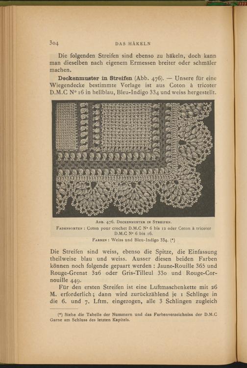 Deckenmuster in Streifen (Abb. 476). — Unsere für eine Wiegendecke bestimmte Vorlage ist aus Coton ä tricoter D.M.C N° 16 in hellblau, Bleu-Indigo 334undweiss hergestellt.