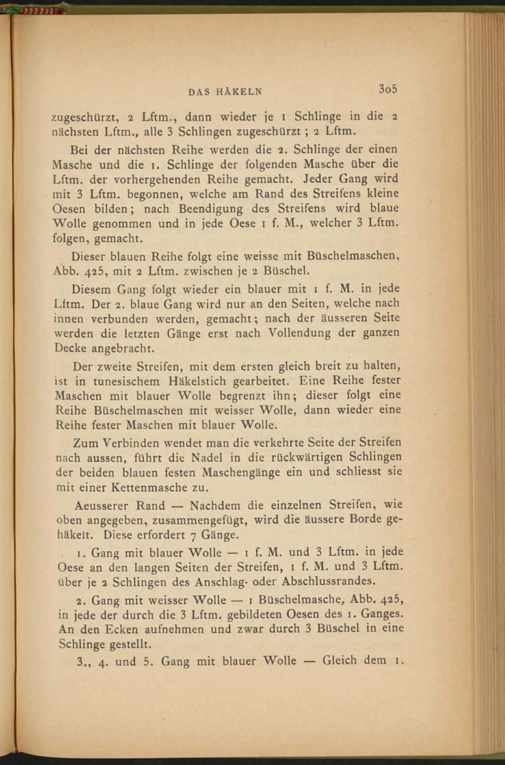 Dieser blauen Reihe folgt eine weisse mit Büschelmaschen, Abb. 425, mit 2 Lftm. zwischen je 2 Büschel.
