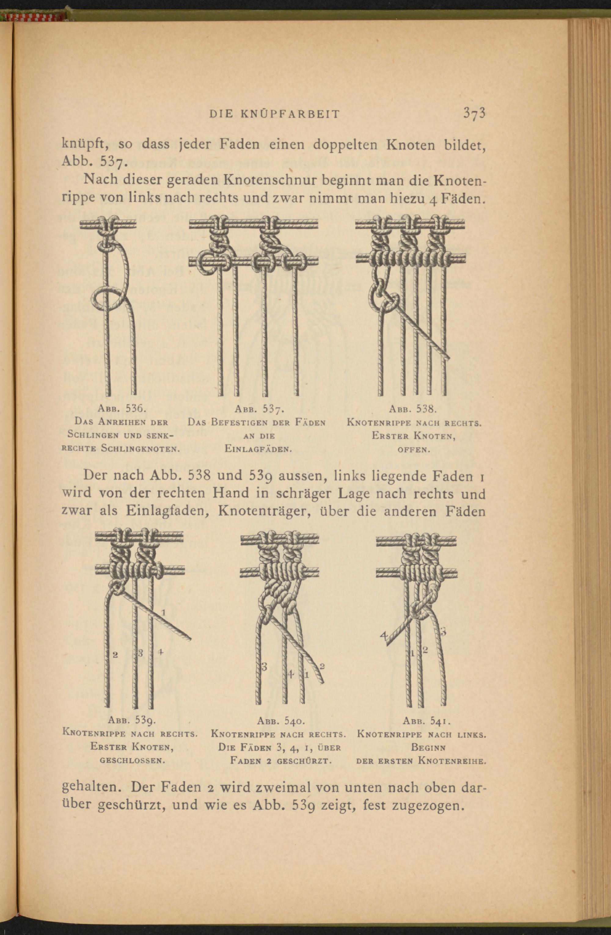 Der nach Abb. 538 und 539 aussen, links liegende Faden 1 wird von der rechten Hand in schräger Lage nach rechts und zwar als Einlagfaden, Knotenträger, über die anderen Fäden