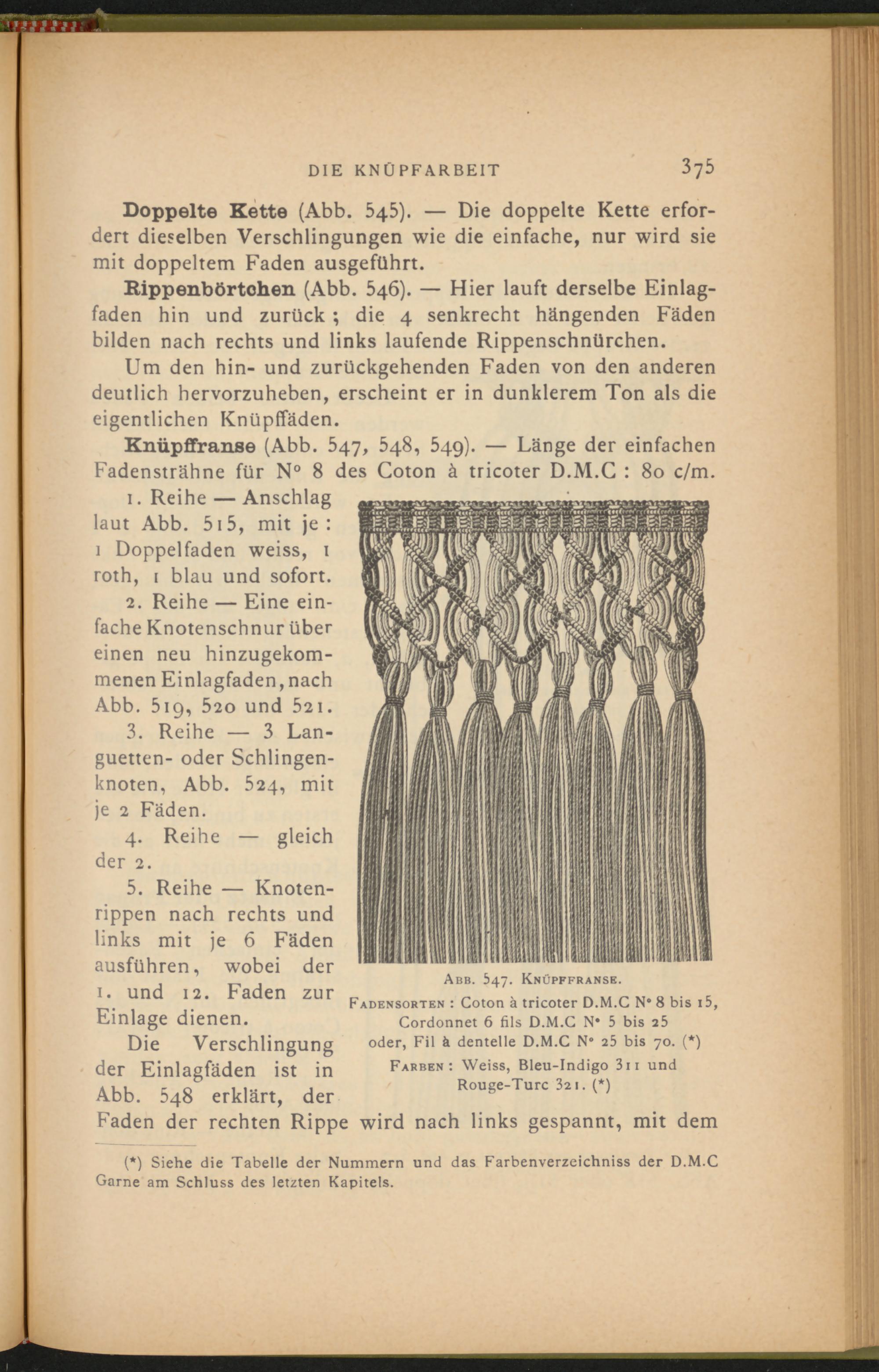 Knüpffranse (Abb. 547, 548, 549). — Länge der einfachen Fadensträhne für N° 8 des Coton ä tricoter D.M.C : 80 c/m.