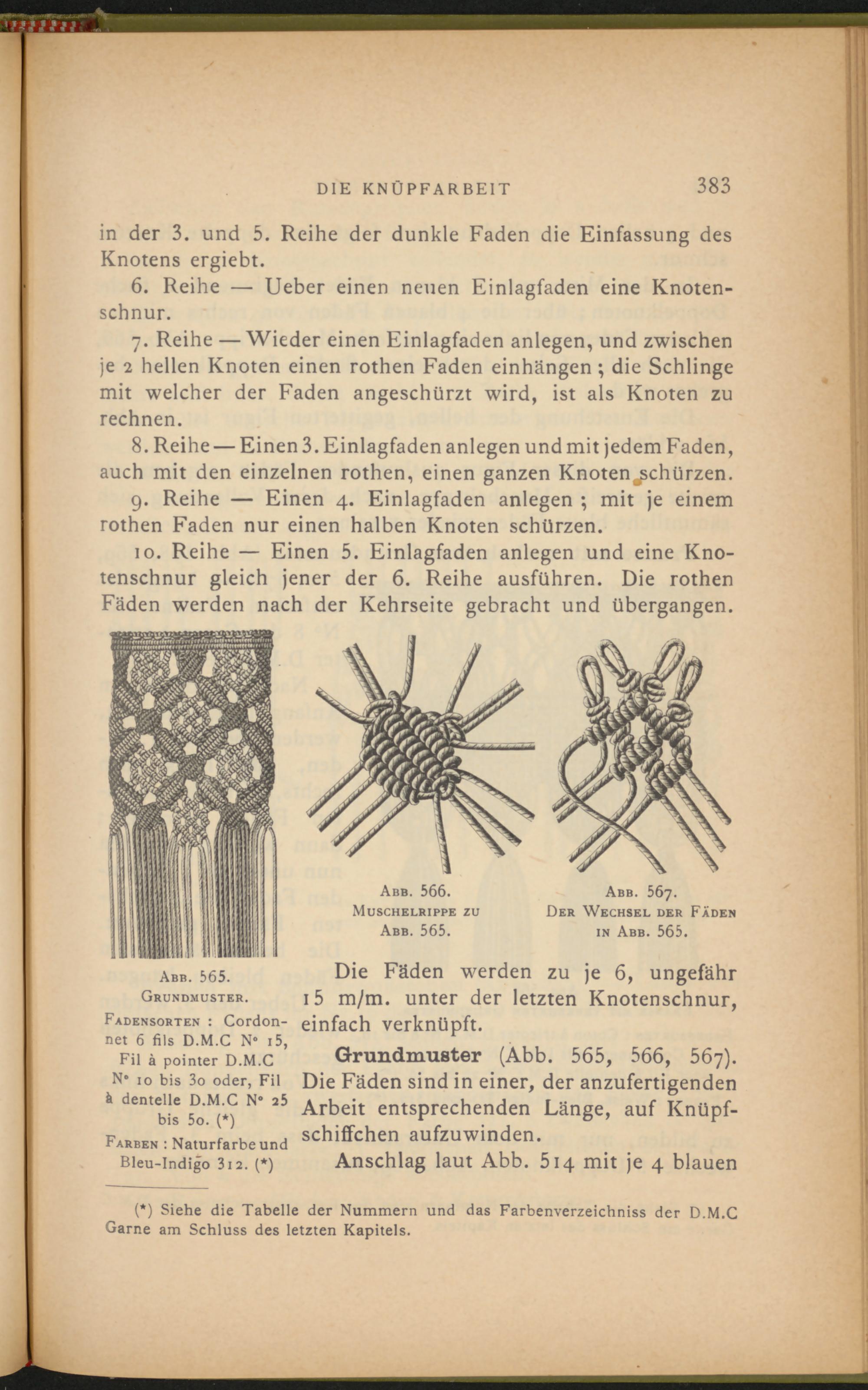 Grundmuster (Abb. 565, 566, 567 ). Die Fäden sind in einer, der anzufertigenden Arbeit entsprechenden Länge, auf Knüpfschiffchen aufzuwinden.