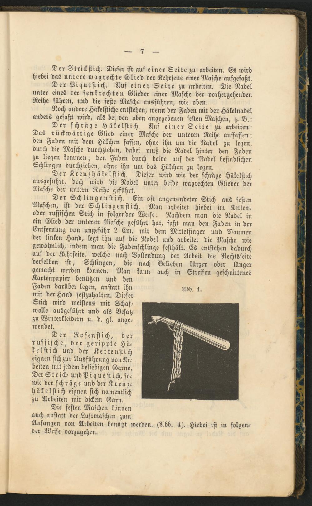 Die festen Maschen können auch anstatt der Luftmaschen zum Anfangen von Arbeiten benutzt werden. (Abb. 4). Hiebei ist in folgen­der Weise vorzugehen.
