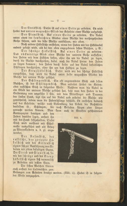 Der Schlingen st ich. Ein oft angewendeter Stich aus festen Maschen, ist der Schlingenstich. Man arbeitet Hiebei im Ketten- oder russischen Stich in folgender Weise: Nachdem man die Nadel in ein Glied der unteren Masche geführt hat, faßt man den Faden in der Entfernung von ungefähr 2 Cm. mit dem Mittelfinger und Daumen der linken Hand, legt ihn auf die Nadel und arbeitet die Masche wie gewöhnlich, indem man die Fadenschlinge festhält. Es entstehen dadurch auf der Kehrseite, welche nach Vollendung der Arbeit die Rechtsseite derselben ist, Schlingen, die nach Belieben kürzer oder länger gemacht werden können. Man kann auch in Streifen geschnittenes Kartenpapier benützen und den Faden darüber legen, anstatt ihn mit der Hand festzuhalten. Dieser Stich wird meistens mit Schaf­wolle ausgeführt und als Besatz zu Winterkleidern u. d. gl. ange­wendet.