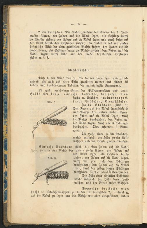 Einfache Stäbchen: (Abb. 6.) Den Faden auf die Nadel legen, diese in eine Masche der untern Reihe führen; den Faden auf