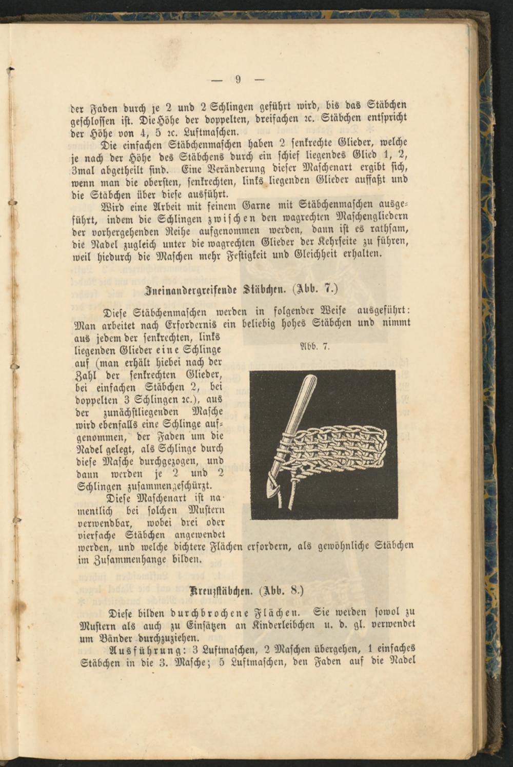 Wird eine Arbeit mit feinem Garne mit Stäbchenmaschen ausgeführt, indem die Schlingen zwischen den wagrechten Maschengliedcrn der vorhergehenden Reihe aufgenommen werden, dann ist es rathsam, die Nadel zugleich unter die wagrechten Glieder der Kehrseite zu führen, weil hicdurch die Maschen mehr Festigkeit und Gleichheit erhalten.