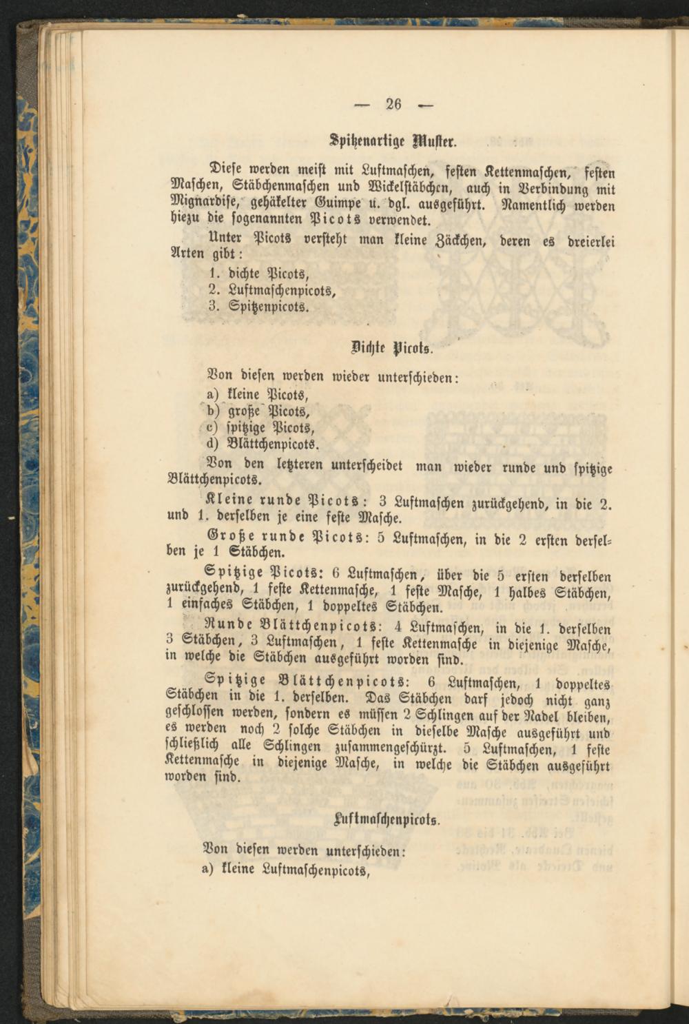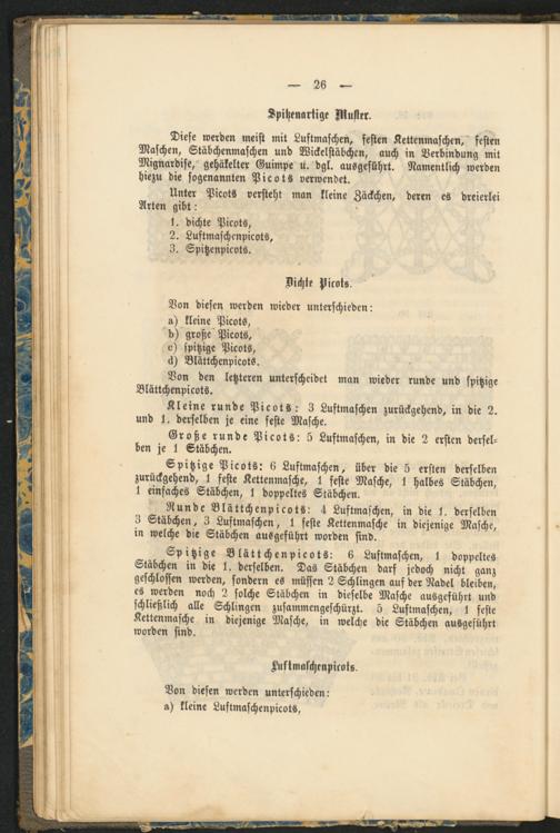 Diese werden meist mit Luftmaschen, festen Kcttenmaschcn, festen Maschen, Stäbchenmaschen und Wickelstäbchcn, auch in Verbindung mit Mignardise, gehäkelter Guimpe ü. dgl. ausgeführt. Namentlich werden hiezu die sogenannten Picots verwendet.