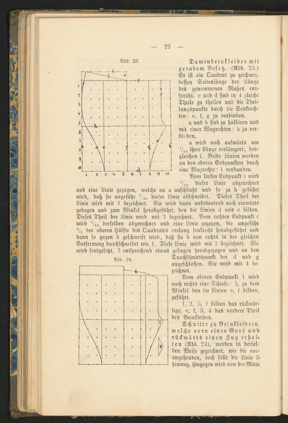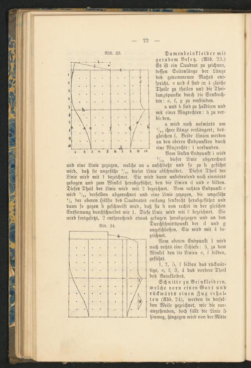 Schnitte zu Beinkleidern, welche vorn einen Gurt und rückwärts einen Zug erhalten (Abb. 24), werden in derselben Weise gezeichnet, wie die vorangehenden, doch fällt die Linie 5 hinweg, hingegen wird von der Mitte