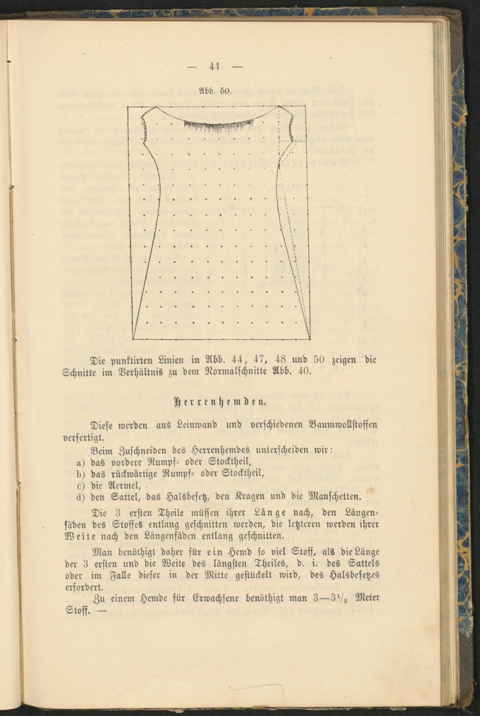 Man benöthigt daher für ein Hemd so viel Stoff, als die Länge der 3 ersten und die Weite des längsten Theiles, d. i. des Sattels oder im Falle dieser in der Mitte gestückelt wird, des Halsbesctzes erfordert.