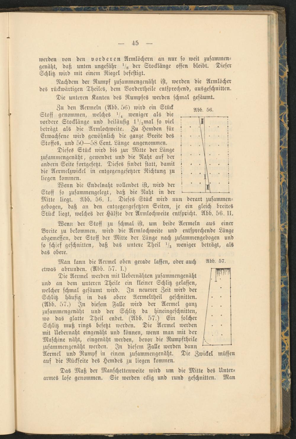 Zu den Aermeln (Abb. 56) wird ein Stück Stoff genommen, welches 1/4 weniger als die vordere Stocklänge und beiläufig l^mal so viel beträgt als die Armlochweite. Zu Hemden für Erwachsene wird gewöhnlich die ganze Breite des Stoffes, und 50—5,8 Cent. Länge angenommen.