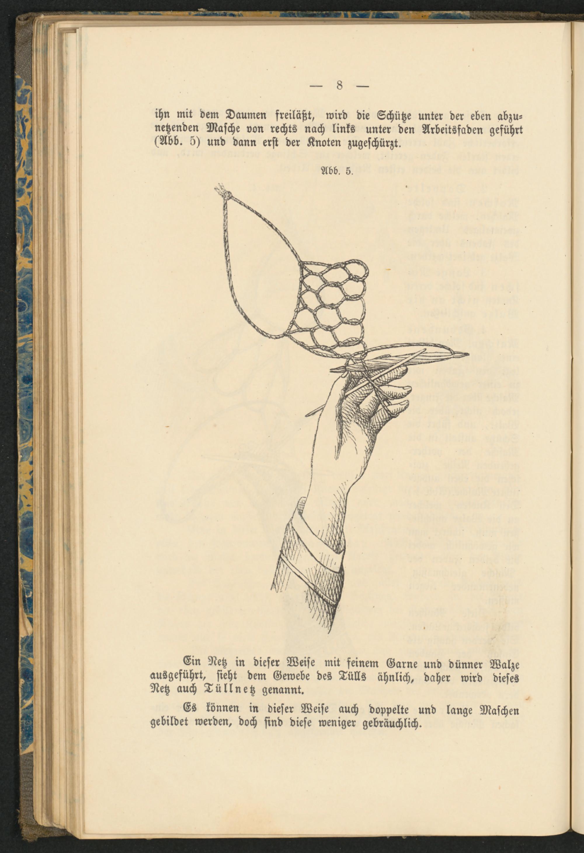 ihn mit dem Daumen freiläßt, wird die Schütze unter der eben abzu- netzenden Masche von rechts nach links unter den Arbeitsfaden geführt (Abb. 5) und dann erst der Knoten zugeschürzt.