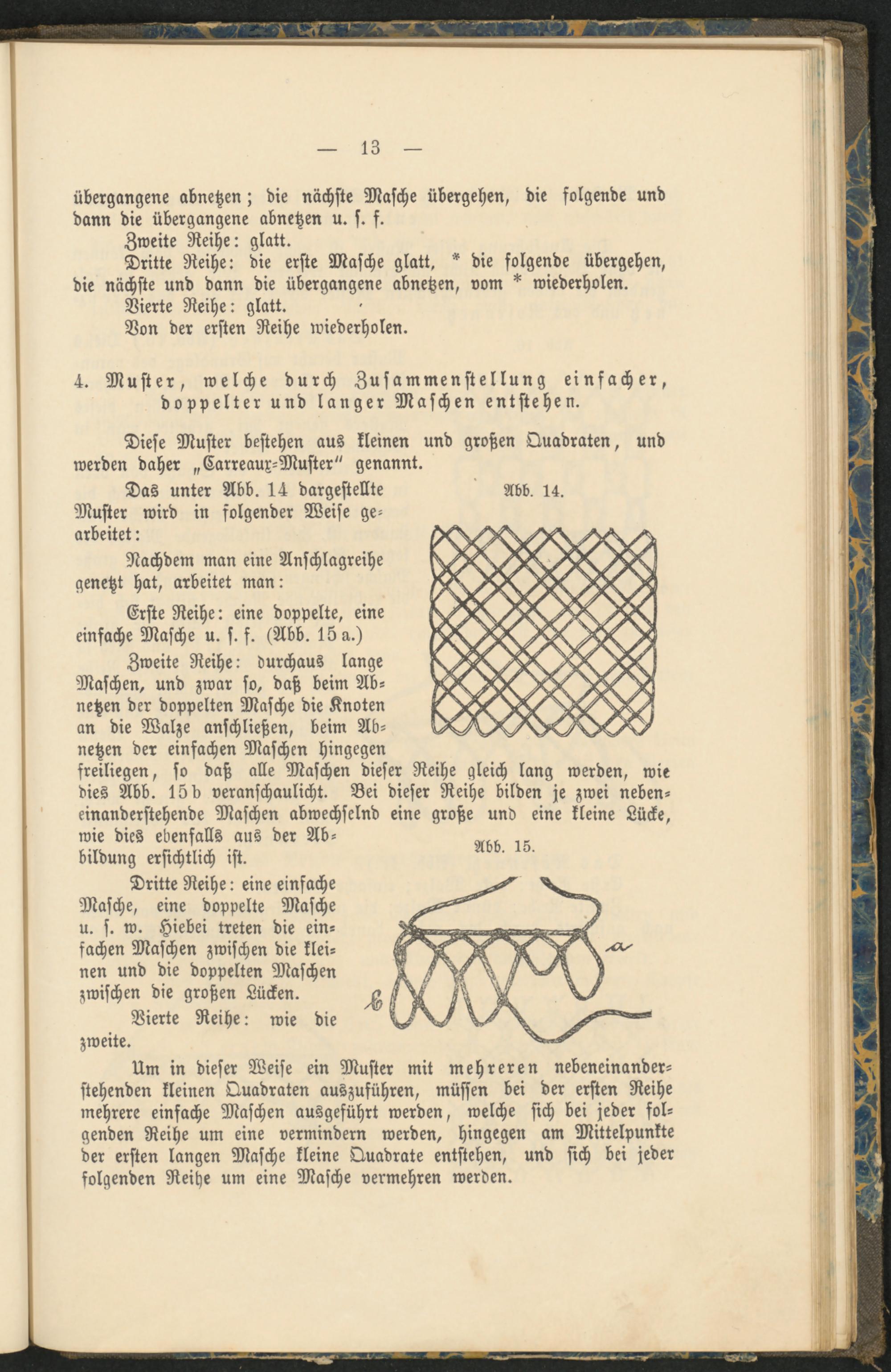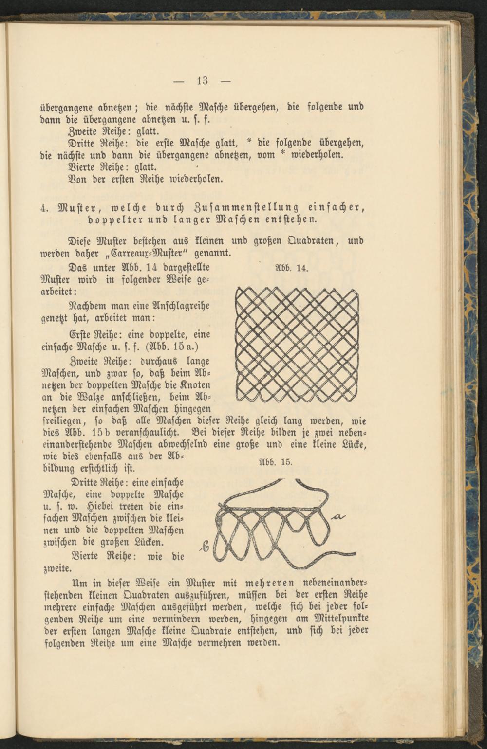 Um in dieser Weise ein Muster mit mehreren nebeneinanderstehenden kleinen Quadraten auszuführen, müssen bei der ersten Reihe mehrere einfache Maschen ausgeführt werden, welche sich bei jeder folgenden Reihe um eine vermindern werden, hingegen am Mittelpunkte der ersten langen Masche kleine Quadrate entstehen, und sich bei jeder folgenden Reihe um eine Masche vermehren werden.
