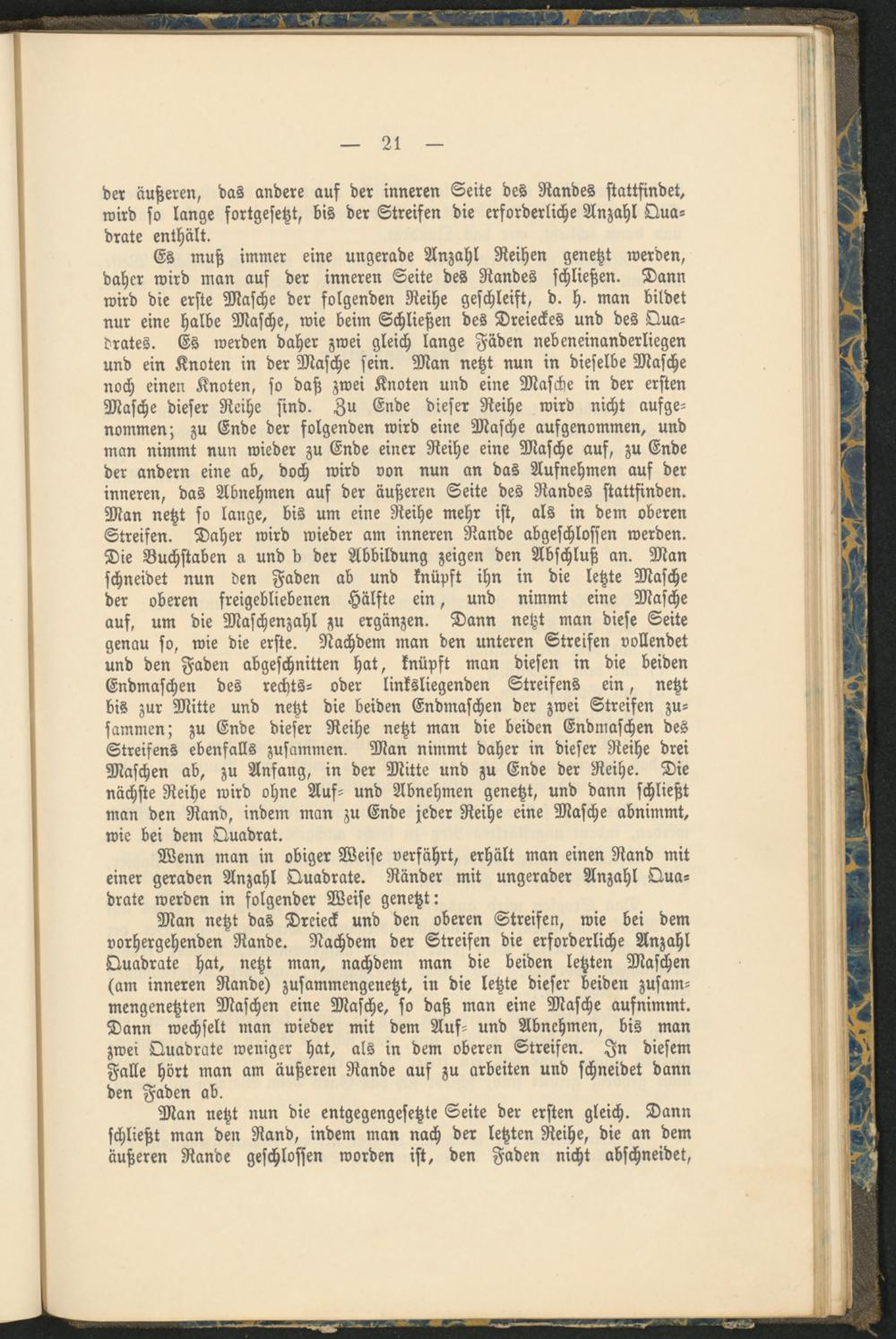 Man netzt das Dreieck und den oberen Streifen, wie bei dem vorhergehenden Rande. Nachdem der Streifen die erforderliche Anzahl Quadrate hat, netzt man, nachdem man die beiden letzten Maschen (am inneren Rande) zusammengenetzt, in die letzte dieser beiden zusam- mengenetzten Maschen eine Masche, so daß man eine Masche aufnimmt. Dann wechselt man wieder mit dem Auf- und Abnehmen, bis man zwei Quadrate weniger hat, als in dem oberen Streifen. In diesem Falle hört man am äußeren Rande auf zu arbeiten und schneidet dann den Faden ab.