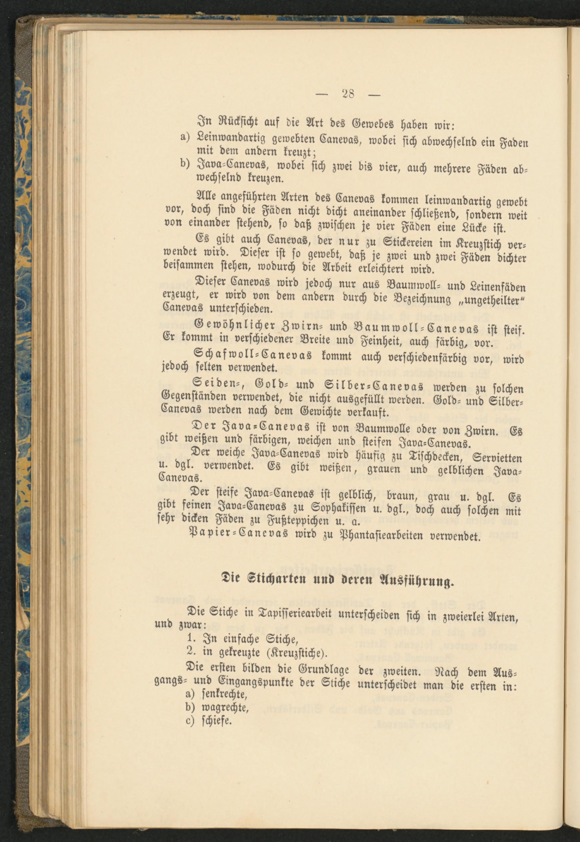 Alle angeführten Arten des Canevas kommen leinwandartig gewebt vor, doch sind die Fäden nicht dicht aneinander schließend, sondern weit von einander stehend, so daß zwischen je vier Fäden eine Lücke ist.